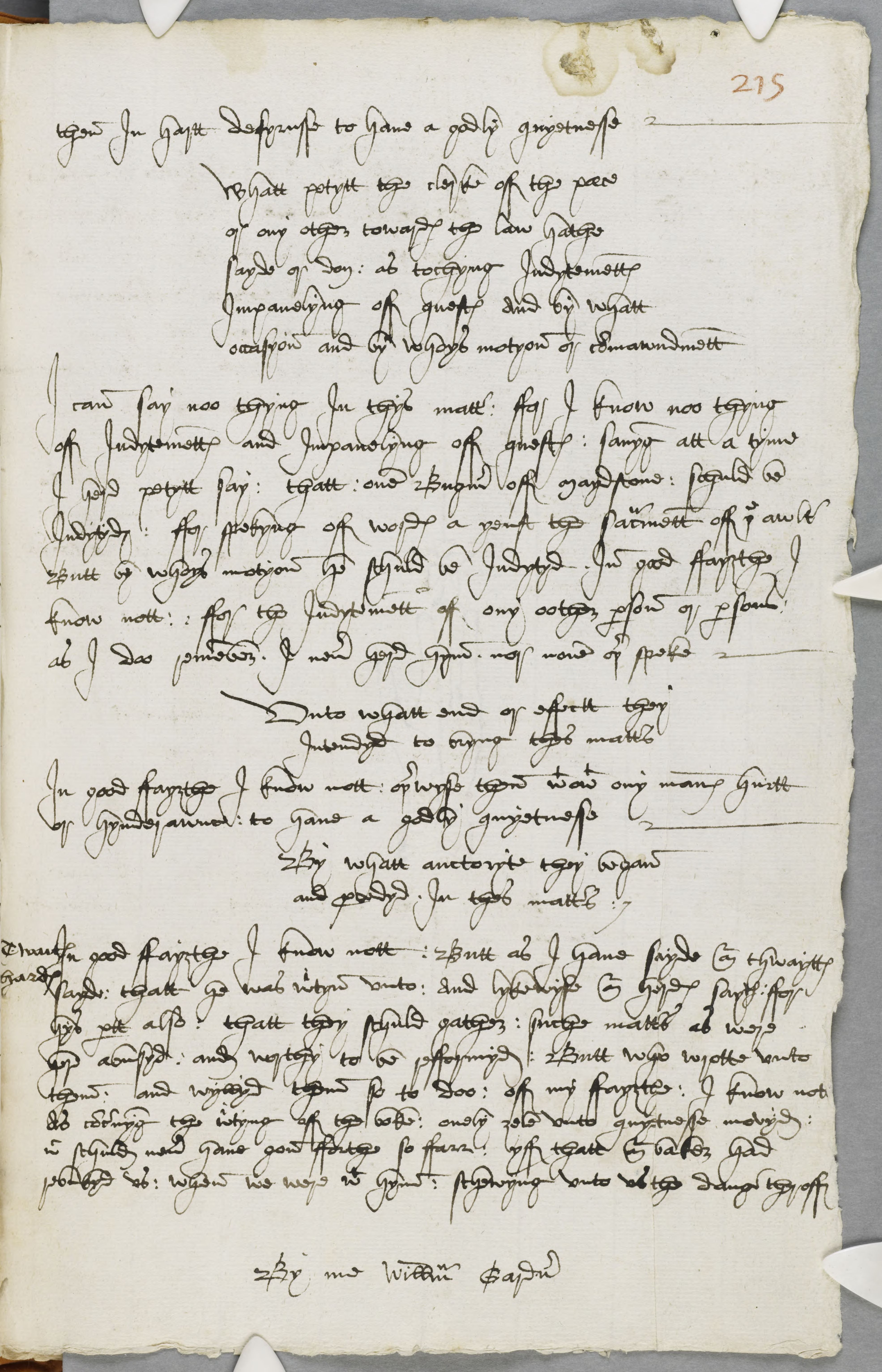 I can say noo thyng In thys matter : ffor I know noo thyng off Indytementtes and Impanelyng off questes : savyng att a tyme I herd petytt say : thatt : one Bugner off maydstone : schuld be Indytyd : ffor spekyng off wordes a yenst the sacramentt off the awlter Butt by whoys motyon he schuld be Indytyd. In good ffaygthe I know nott : : ffor the Indytementt off any oother person or persons : as I doo remember. I never herd hym. nor none other speke.