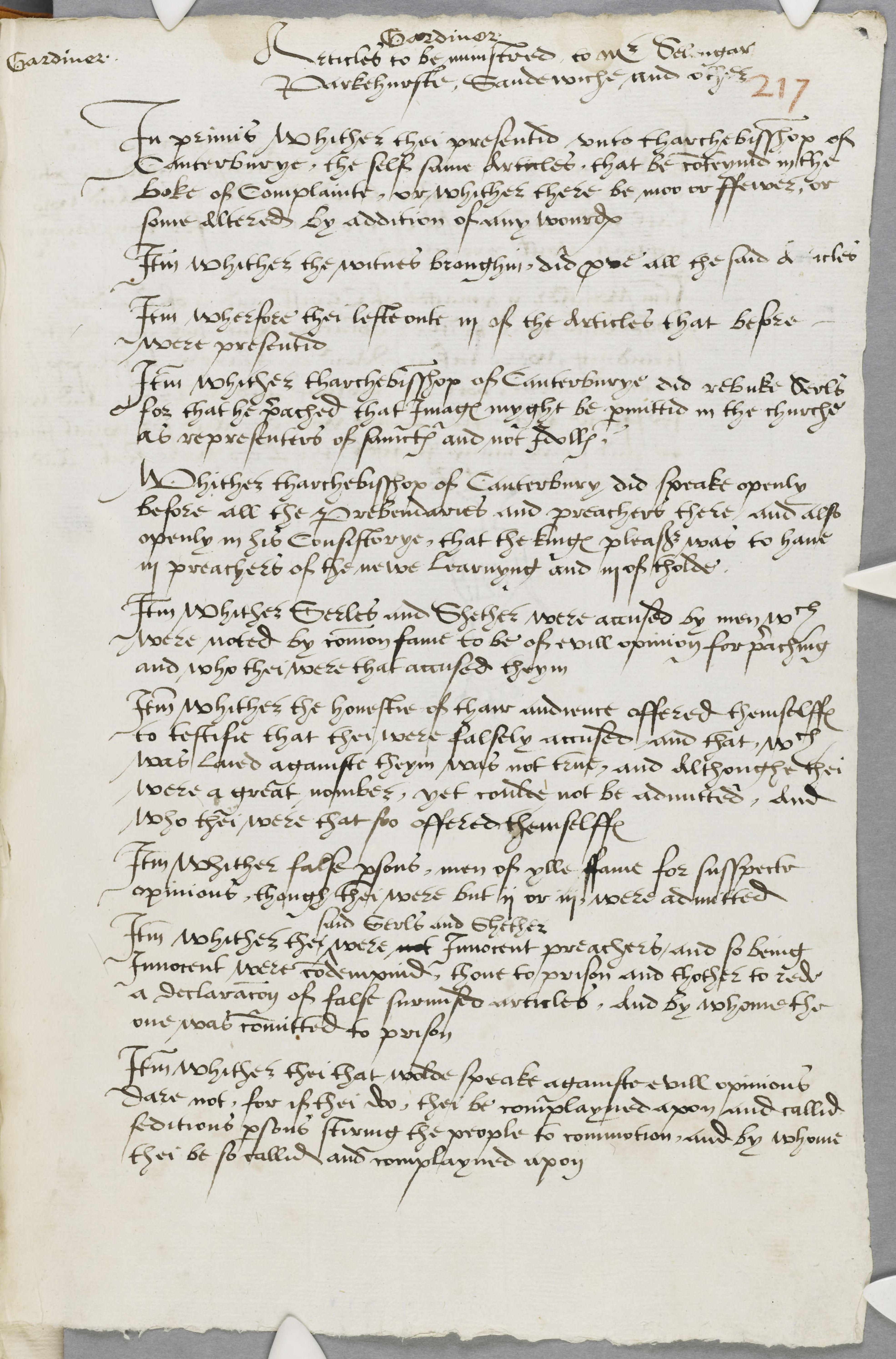 In primis Whither thei presentid unto tharchebisshop of Canterburye, the self same Articles, that be conteynid in the boke of Complainte, or whither there be moo or ffewer, or some Altered by addition of any wourdes