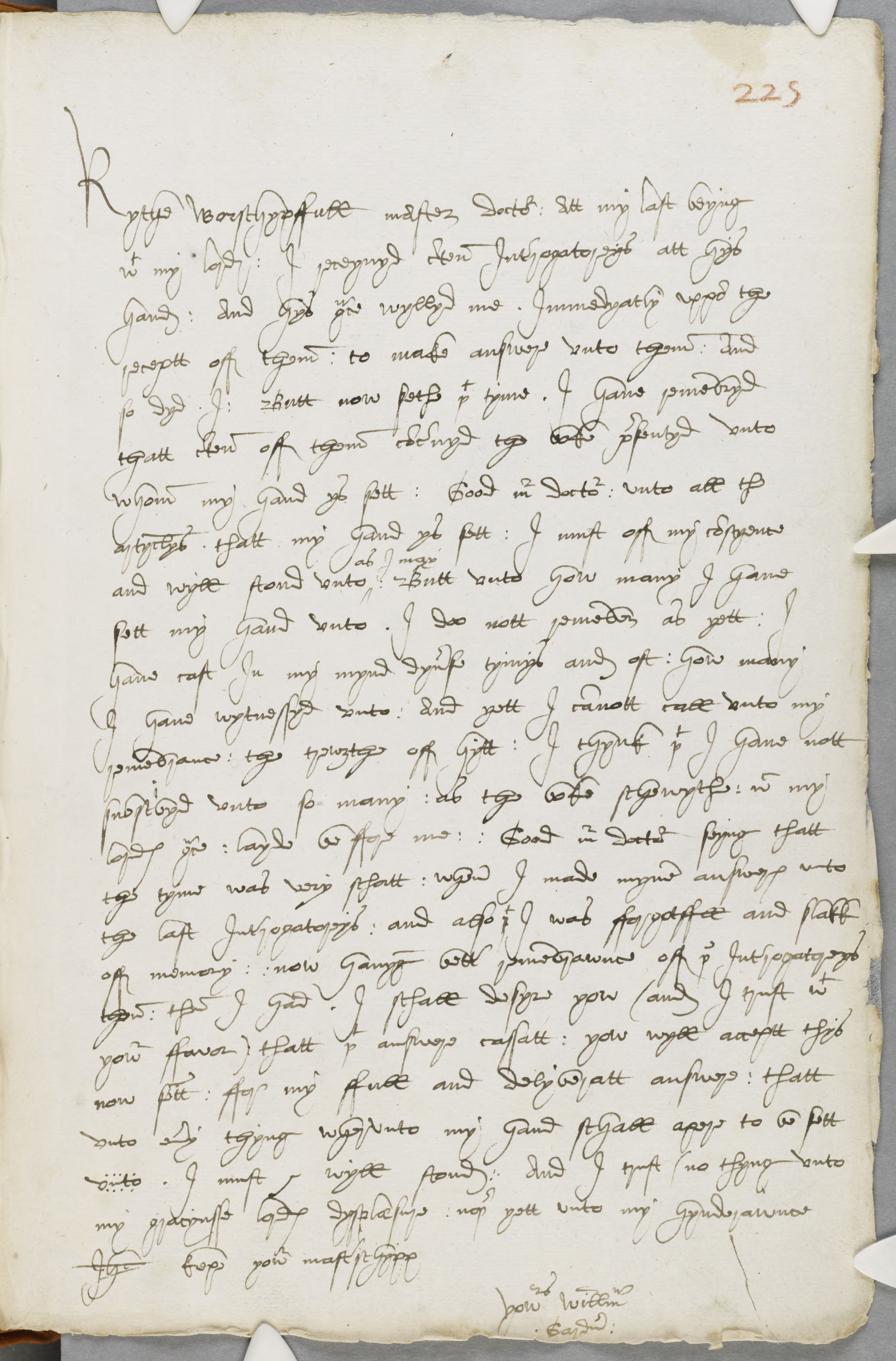 Rythe worschypfull master doctour : Att my last beyng with my lord: I receyvyd certen Interrogatoreys att hys handes : And hys grace wylled me Immedyatly uppon the receptt off them : to make answere unto them: And so dyd I : Butt now sethe that tyme. I have remembryd thatt certen off them concernyd the boke presentyd unto whom my hand ys sett: Good Mr doctour: unto all the artyclys thatt my hand ys sett : I must off my conscyence and wyll stond unto as I may: Butt unto how many I have sett my hand unto. I doo not remember as yett: I have cast In my mynd dyverse tymys and oft: how many I have wytnessyd unto: And yett I cannott call unto my remembrance: the trowzthe off hytt: I thynk that I have nott subscribyd unto so many : as the boke schewythe: which my lordes grace : layde be ffore me: Good Mr doctour seying thatt the tyme was very schortt: when I made myne answeres unto the last Interrogatoreys: and also that I was fforgotfull and slakk off memory: : now havyng better remembrawnce off the Interrogatoreys than then I had. I schall desyre yow (and I trust with yowr ffavor) thatt that answere cassatt: yow wyll acceptt thys now sett : ffor my full and delyberatt answere : thatt unto every thyng wherunto my hand schall apere to be sett unto. I must & wyll stond: And I trust (no thyng unto my gracyusse lordes dysplaesure: nether yett unto my hynderawnce Jhesus kepe yowr masterschypp