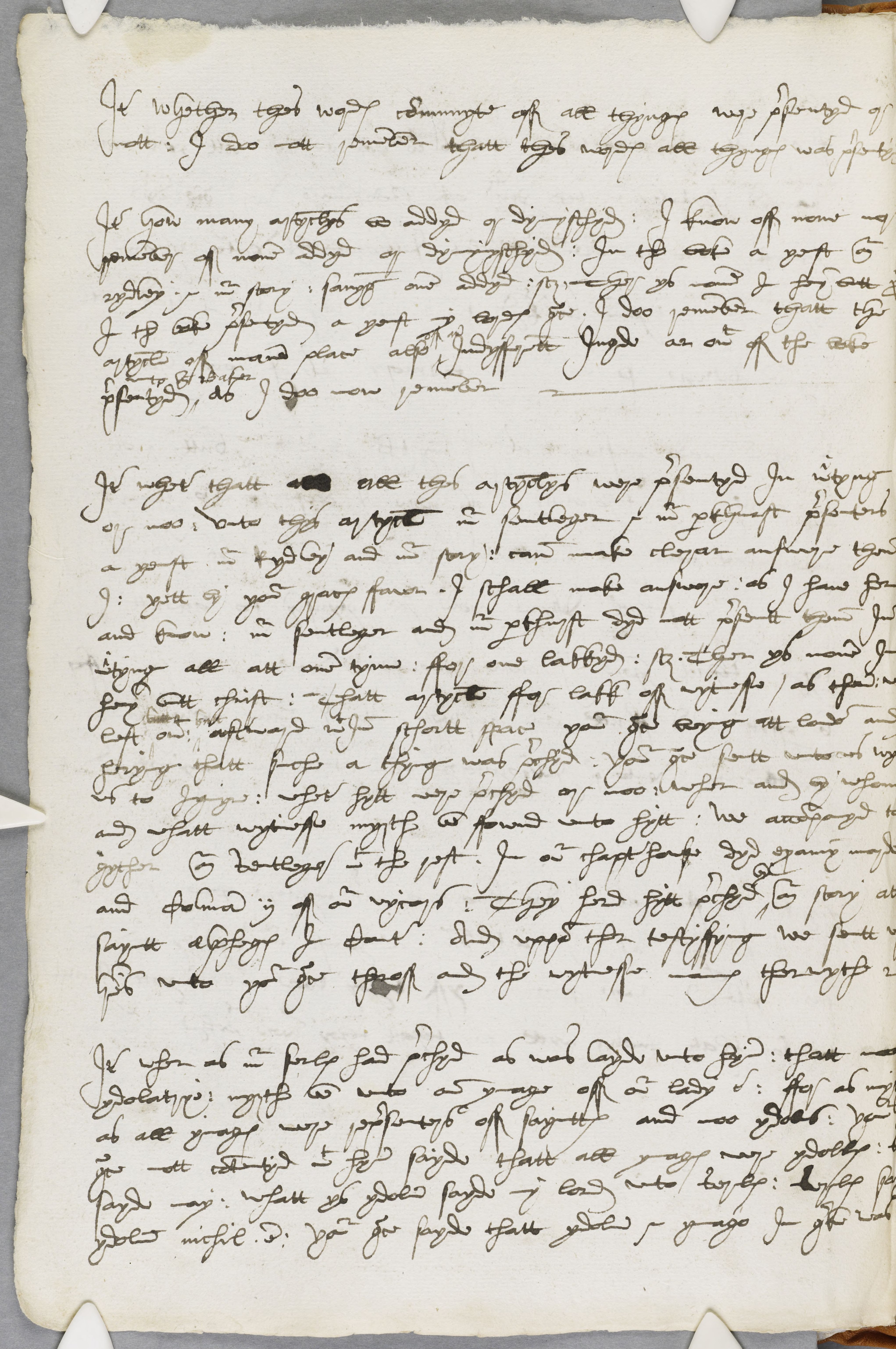 Item wheter thatt all thes artyclys were presentyd In writyng or noo : unto thys artycl mr sentleger & mr parkhurst presenters a yenst mr Rydley and mr scory : can make clerar answere then I : yett by your graces ffavor. I schall make answere : as I have here and know : mr sentleger and mr parkhurst dyd nott presentt them In writing all att one tyme : ffor one lakkyd : scz. Then ys none In hevyn butt christ : Thatt artycle ffor lakk of wytnesse / as then was? left out but afterward within schortt space your grace beyng att london and heryng thatt suche a thynge was prechyd : your grace sentt unto us wy? us to Inquyre : wheter hytt were prechyd or noo : wher and by whom and whatt wytnesse mygth be ffownd unto hytt ; We accompanyd to gyther mr sentleger with the rest. In our chapterhowse dyd examyn morden and Colman ii off owr vycars : They herd hytt preched by mr scory at sayntt alpheges In canterbury : And uppon ther testyffyng we sentt up letters unto your grace theroff and the wytnesse names therwyth.
