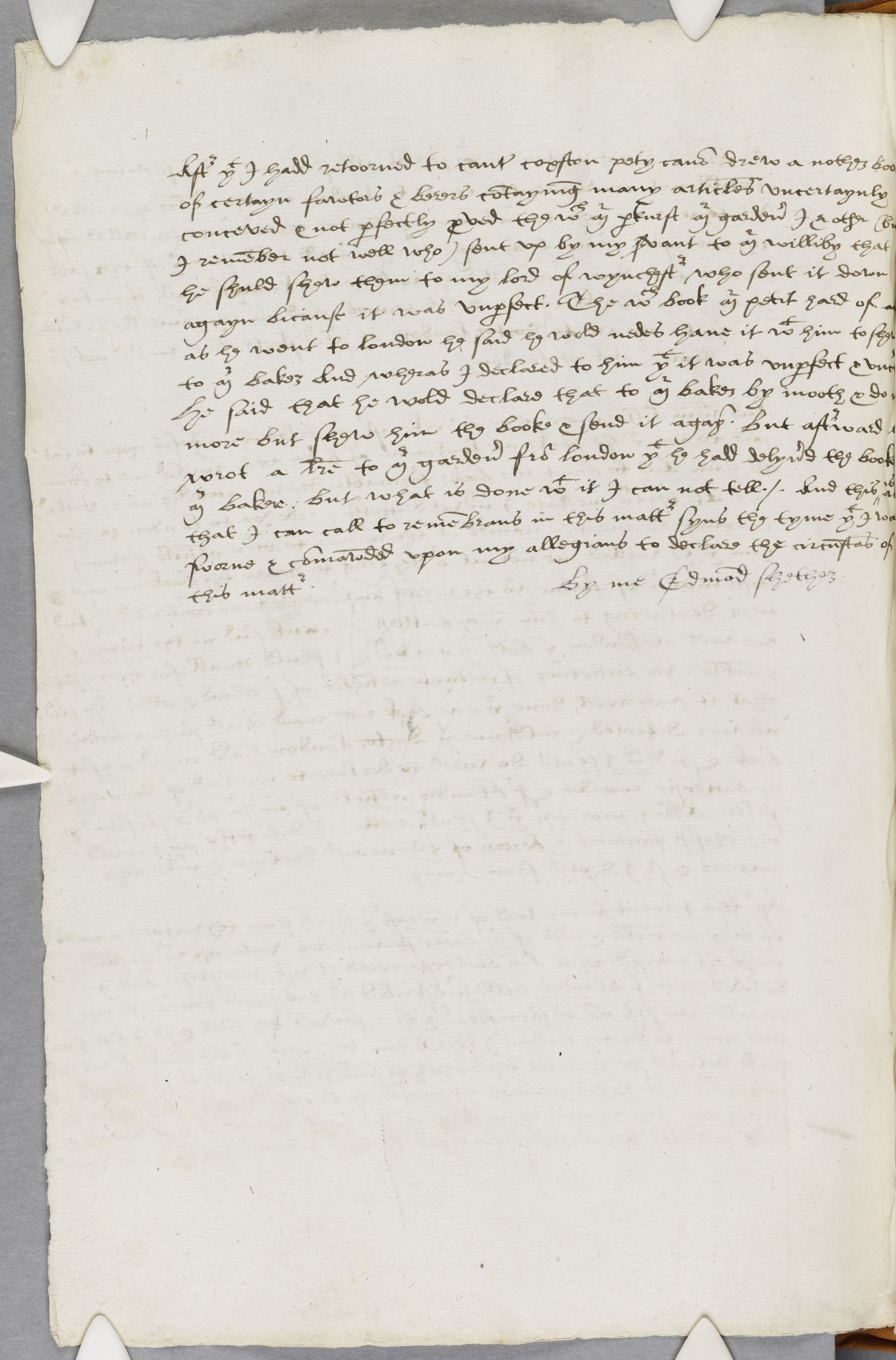 After that I hadd retoorned to canterbury coxton pety canon drew a nother book of certayn fawtors & berers contayning many articles uncertaynly conceved & not perfectly proved the which Mr parkurst Mr gardener I & other (but I remember not well who) sent up by my servant to Mr williby that he shuld show them to my lord of wynchester who sent it down agayn bicause it was unperfect. The which book Mr petit hard of and as he went to london he said he wold nedes have it with him to show to Mr baker And wheras I declared to him that it was unperfect & uncertain he said that he wold declare that to Mr baker by mooth & do no more but shew him the booke & send it agayn. but afterward he wrot a lettre to Mr gardener from london that he hadd delyverd the book to Mr baker. But what is done with it I can not tell. And this is all that I can call to remembrans in this matter syns the tyme that I was sworne & commawnded upon my allegians to declare the circumstans of this matter.