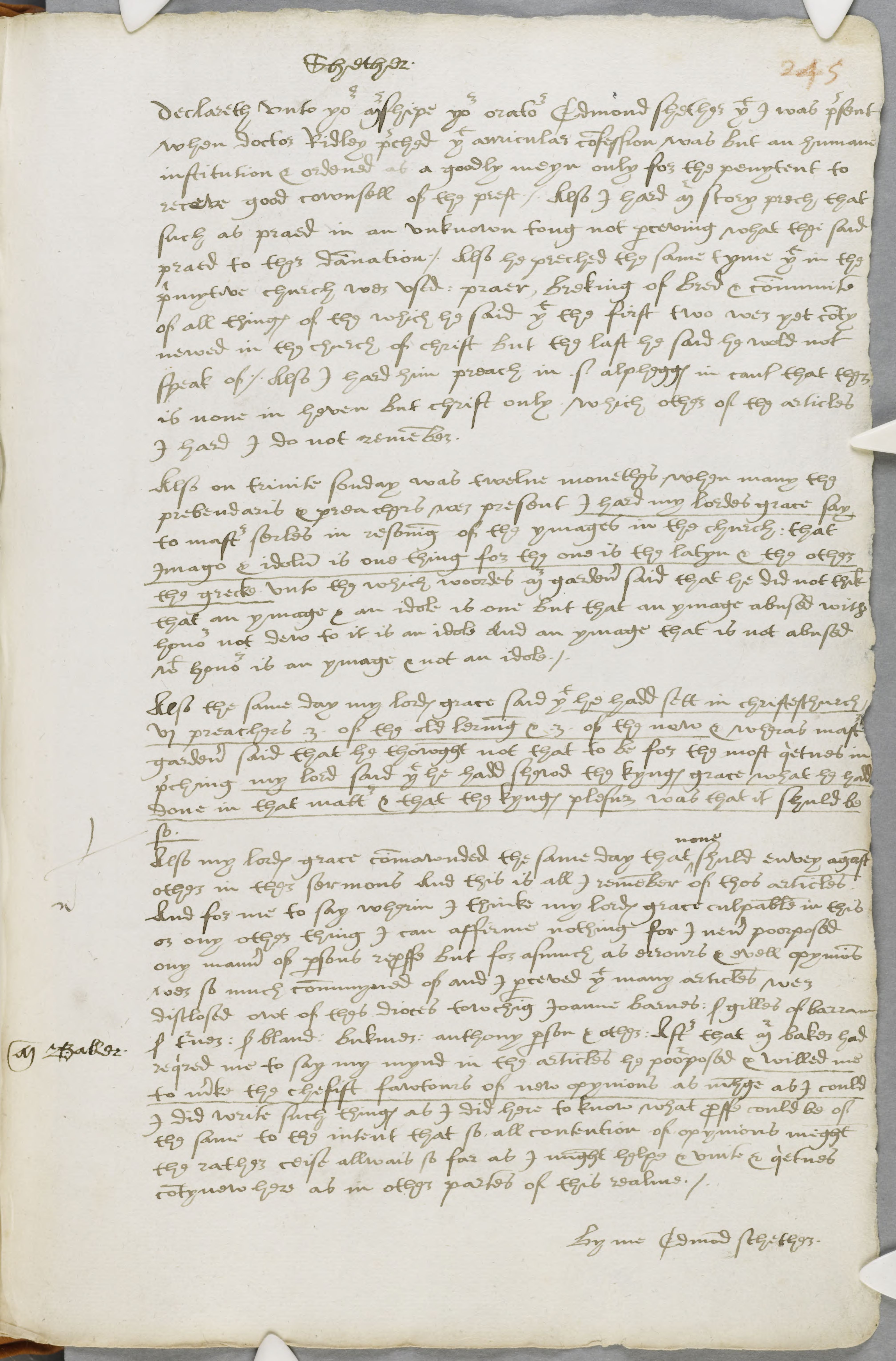 Also my lordes grace commawnded the same day that none shuld envey aganst other in ther sermons And this is all I remember of thos articles And for me to say whein I think my lordes grace culpable in this or any other thing I can affirme nothing for I never poorposed any manner of persons reproffe but for asmuch as errours & evell opynions wer so much communed of and perceved that many articles wer disclosed owt of thes dioces towching Joanne barnes: Sir gilles of barram Sir turner: Sir Bland: bukmer: anthony parson & other: After that Mr baker had required me to say my mynd in the articles he poorposed & willed me to marke the chefist fawtours of new opynions as nihge as I could I did write such thinges as I did here to know what proffe could be of the same to the intent that so all contention of opynions might the rather ceise allwais so far as I might helpe & unite &quietnes contynew here as in other partes of this realme./.