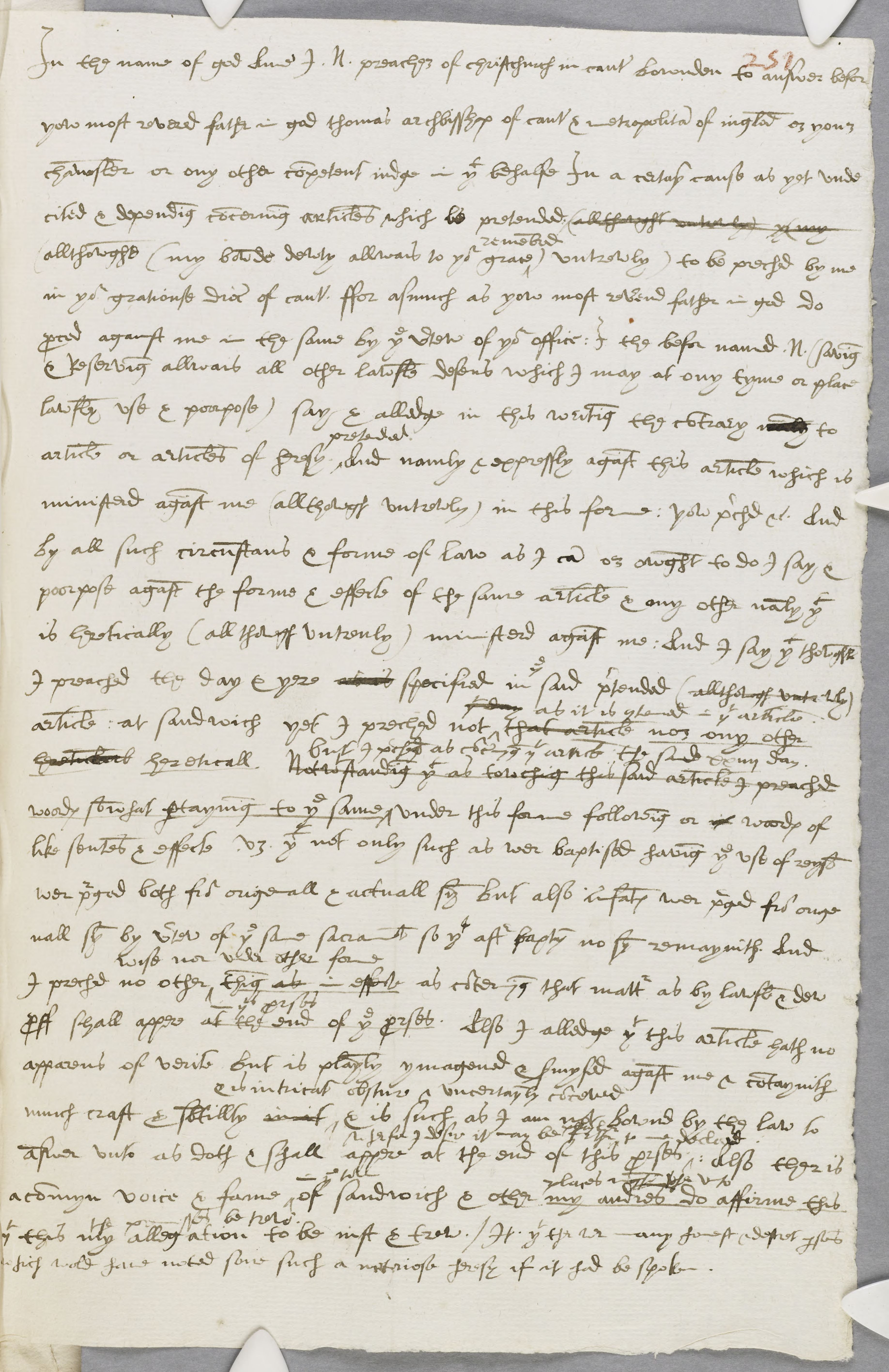 In the name of god Amen. I N. preacher of christchurch in canterbury bownden to answer befor yow most reverd father in god thomas archbisshop of canterbury & metropolitan of ingland or your chawnsler or ony other competent iudge in that behalfe In a certayn cause as yet undecited & depending concerning articles which be pretended: (allthough untrewly) y (my (allthowghe (my bownde dewty allwais to your grace remembred ) untrewly) to be preched by me in your gratiouse diocese of canterbury ffor asmuch as yow most reverend father in god do proced against me in the same by the vertew of your office: I the befor named N. (saving & Reserving allwais all other lawfule defens which I may at ony tyme or place lawfuly use & poorpose) say & alledge in this writing the contrary namly to article or articles of heresy pretended And namly & expressly aganst this article which is ministerd aganst me (allthrough untrewly) in this forme: yow preched etc. And by all such circumstans & forme of law as I can or owght to do I say & poorpose aganst the forme & effecte of the same article & any other namly that is heretically (allthowgh untreuly) ministerd aganst me: And I say that thowghe I preached the day & yere as is specified in the said pretended (allthough untrewly) article : at sandwich yet I preched notthat day as it is contened in your article that article nor any other heretickal hereticall Notwithstanding that as towching this said article I preached woords somwhat pertayning to the same but I preched as concernyng that article the saide xxiiii day under this forme following or woords of like sentens & effecte vz that not only such as wer baptised having the use of reyson wer purged both from origenall & actuall syn but also infantes wer purged from origenall syn by verteu of the same sacrament so that after baptym no syn remaynith And I preched no other wise nor under other forme things as in effecte as concernyng that matter as by lawfule & dew proff shall appere at the end of the prorses in this prorses. Also I alledge that this article hath no apparens of verite but is playnly ymagened & sermysd aganst me & contaynith much craft & subtillty in it & is intricat obscure & uncertaynly conceved & is such as I am not bownd by the law to answer unto as doth & shall appere at the end of this prorses wherfor I desire it may be playlen to me declared : Also ther is a commyn voice & fame in the vill of sandwich & other places which use unto my audres do affirme this that this my allegation to be iust & trew. It. that ther wer any honest and descet persons which wold have noted sone such a notoriose heresy it it had be spoken.