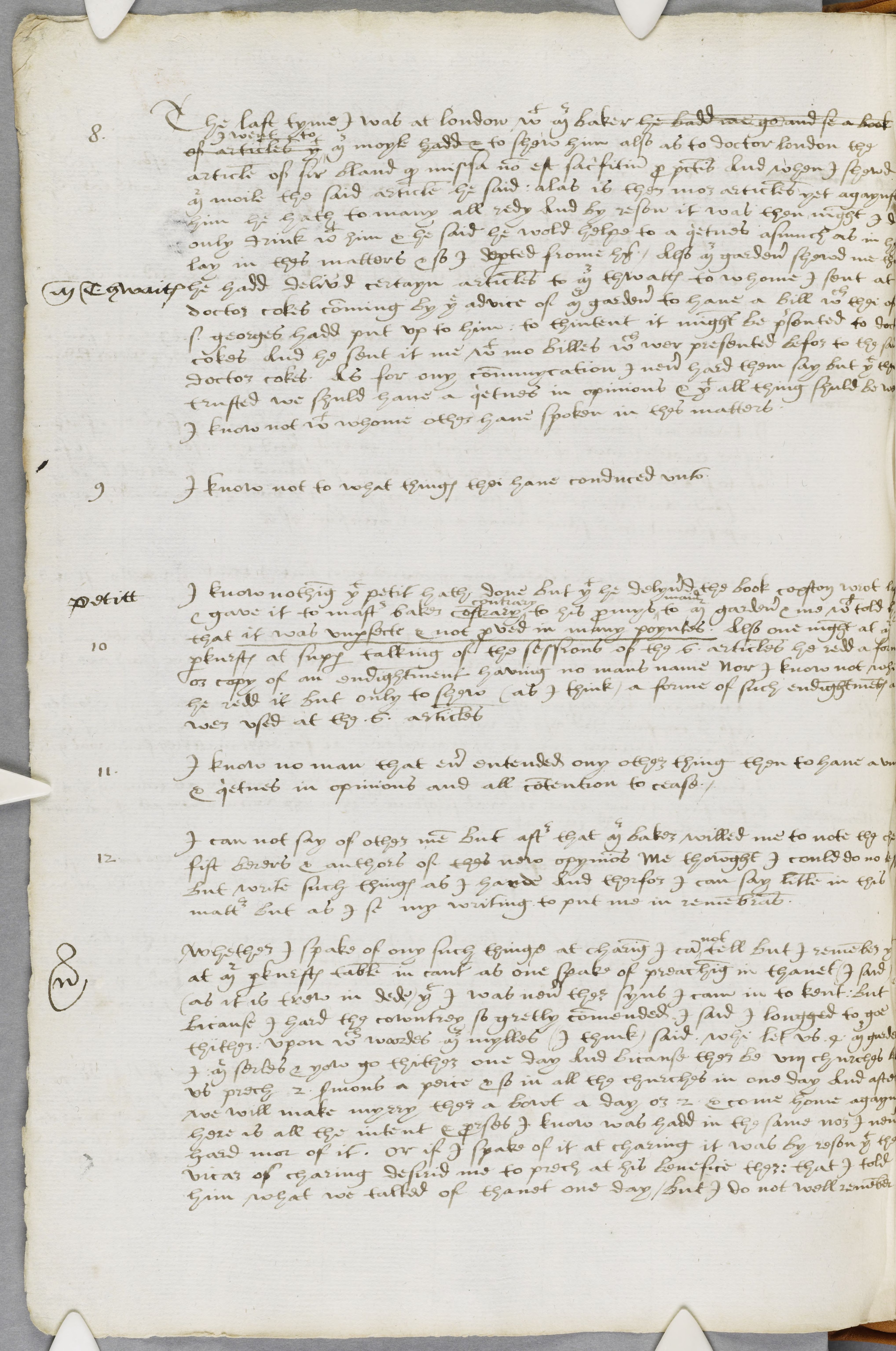I know nothing that petit hath done but that he delyverd the book coxston wrot las[t] & gave it to master baker constrary contrary to his promys maide to mr gardener & me which told h[ym] that it was unperfecte & not proved in many poyntes. Also one night at Mr parkhurstes at supper talking of the sessions of the 6 articles he redd a form or copy of an endightment having no mans name Nor I know not whi he redd it but only to shew (as I think) a forme of such endightmentes as wer used at the 6 articles