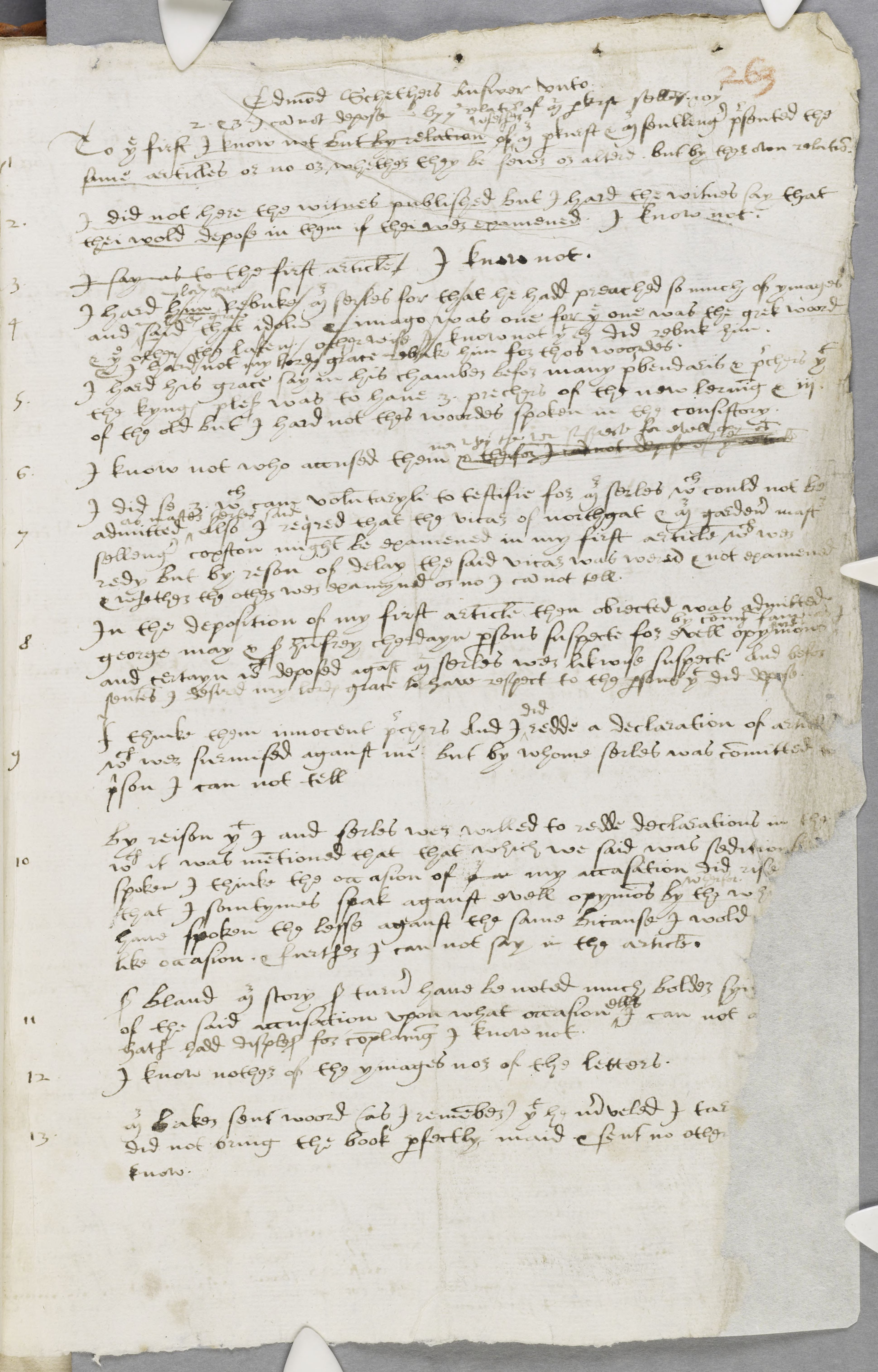 By reison that I and serles wer willed to redde declarations in the which it was mentioned that that which we said was seditiously spoken I thinke the occasion of our my accasation did rise that I somtymes spak aganst evell opynions by the which wherfor have spoken the lesse aganst the same bicause I wold like occasion. & further I can not say in the article.