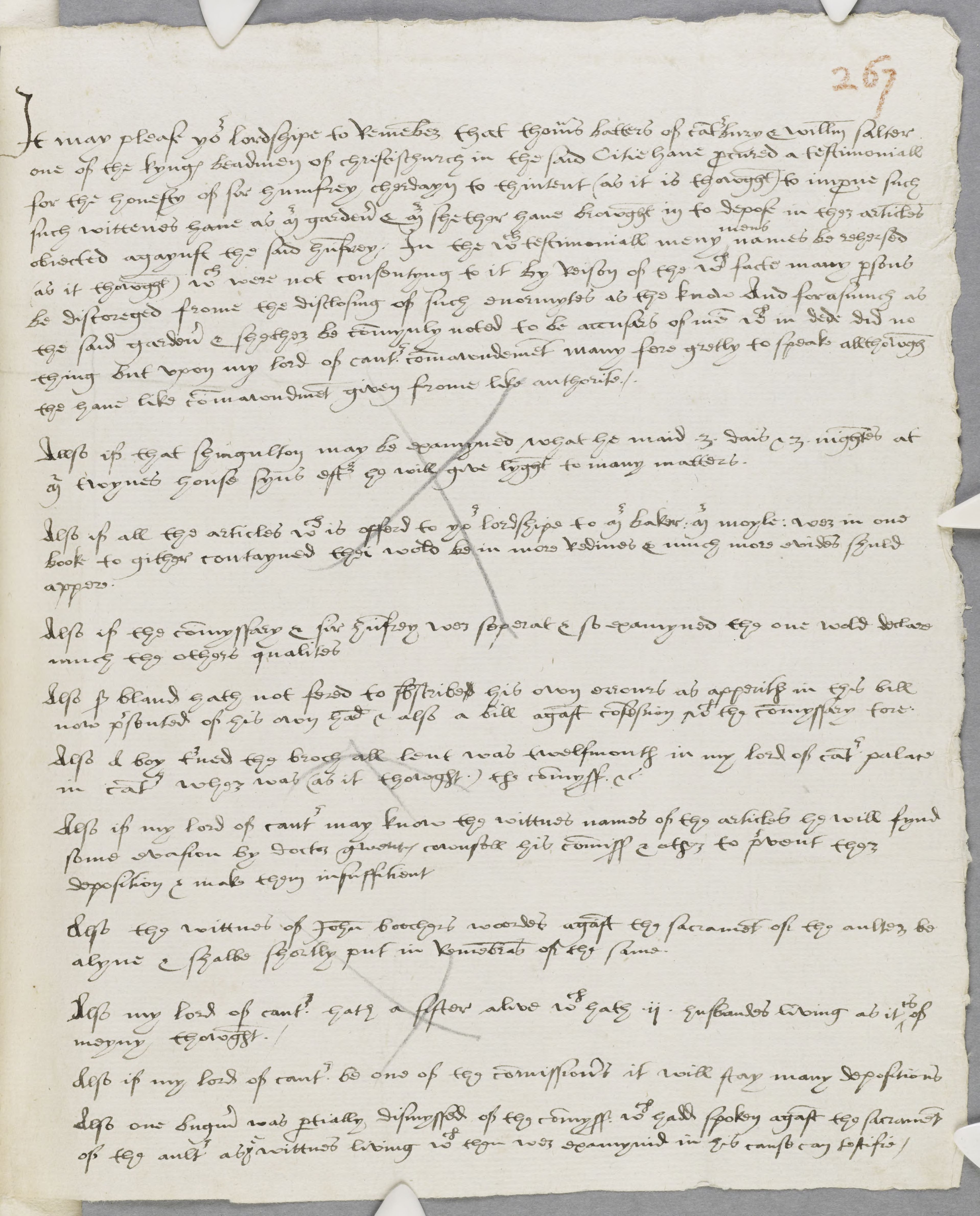 It may please your lordshipe to Remember that thomas batters of canterbury & william salter one of the kynges beadmen of christischurch in the said Citie haue procured a testimoniall for the honesty of sir humfrey cherdayn to thintent (as it is thowght) to improve such such wittenes have as mr gardener & mr shether have browght in to depose in ther articles obiected agaynst the said humfrey. In the which testimoniall meny mens names be rehersed (as it thowght) which were not consentyng to it by Reison of the which facte many persons be discoreged frome the disclosing of such enormytes as the know And forasmuch as the said gardener & shether be commynly noted to be accusars of men which in dede did no thing but upon my lord of canterbury commawndement many fere gretly to speake allthowgh the have like commawndment given frome like authorite./.