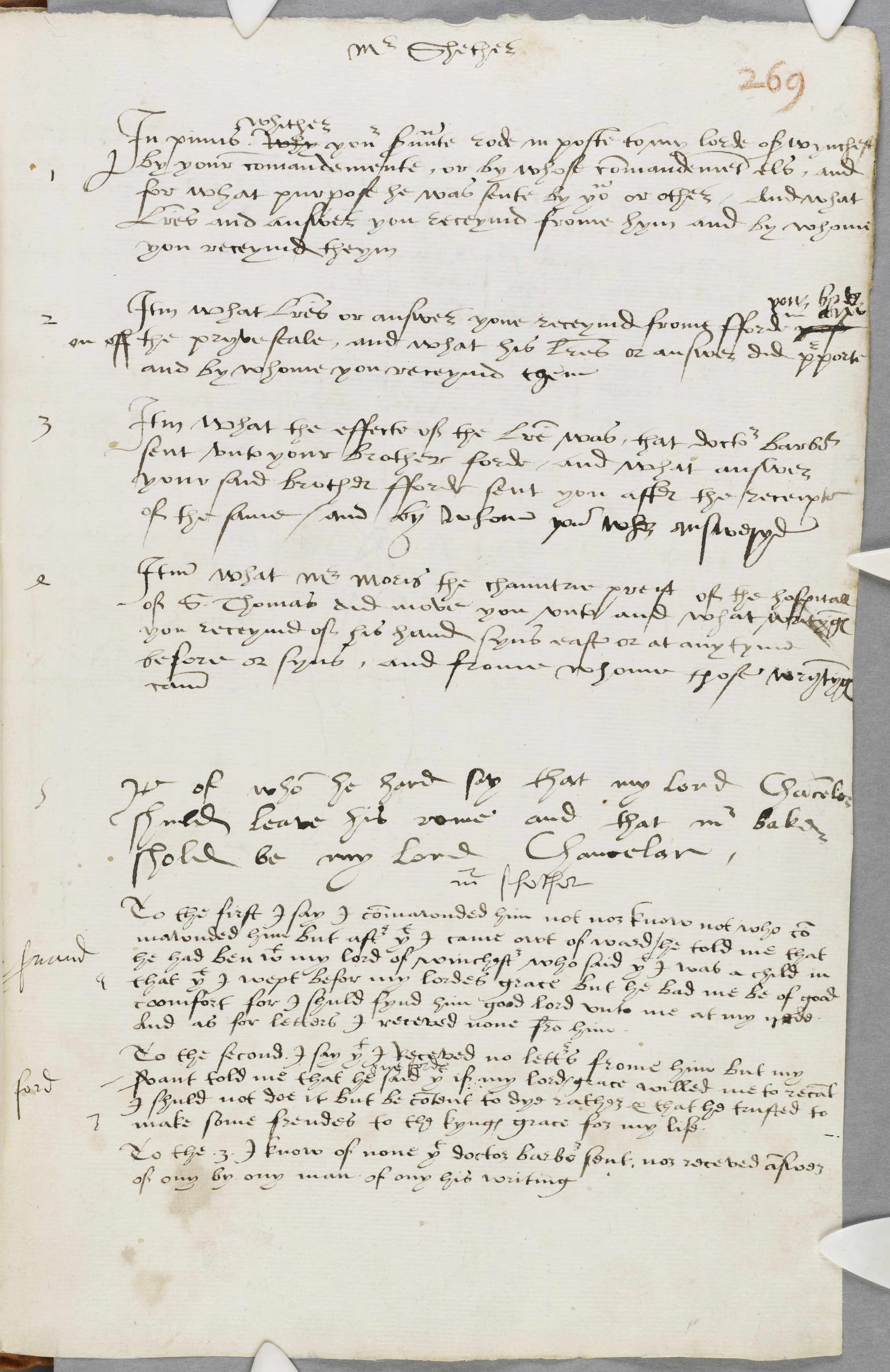 In primis whither why your servaunte rode in poste to my lorde of Wynchester by your commandemente, or by whose commandement els, and for what purpose he was sente by you or other / And what Lettres and answer you receyvid frome hym and by whome you receyvid theym
