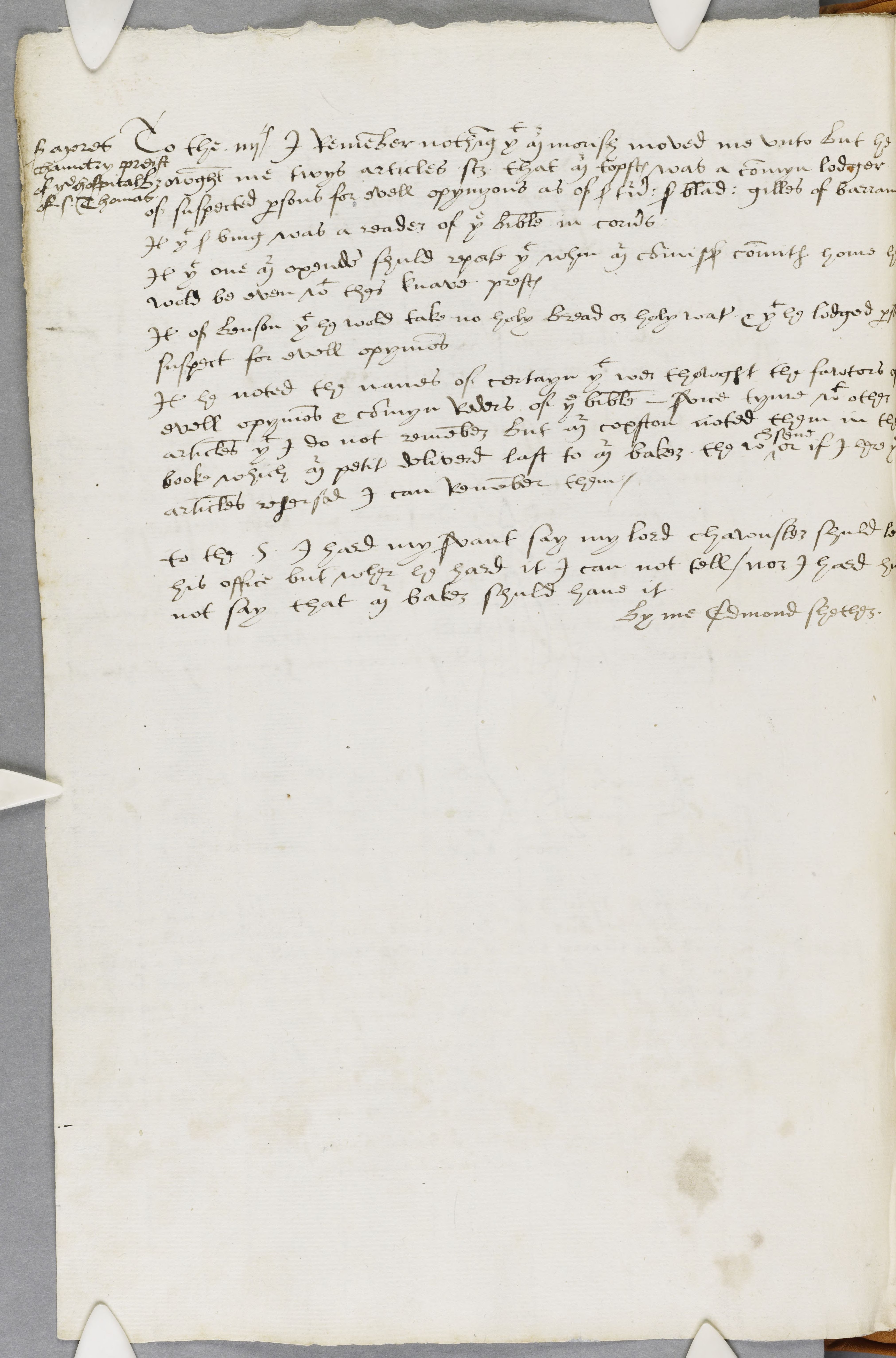 To the iiiith I Remember nothing that mr morish moved me vnto but he browght me twys articles stz that Mr topstes was a commyn lodger of suspected persons for evell opynyons as of Sir turner: Sir bland: gilles of barram