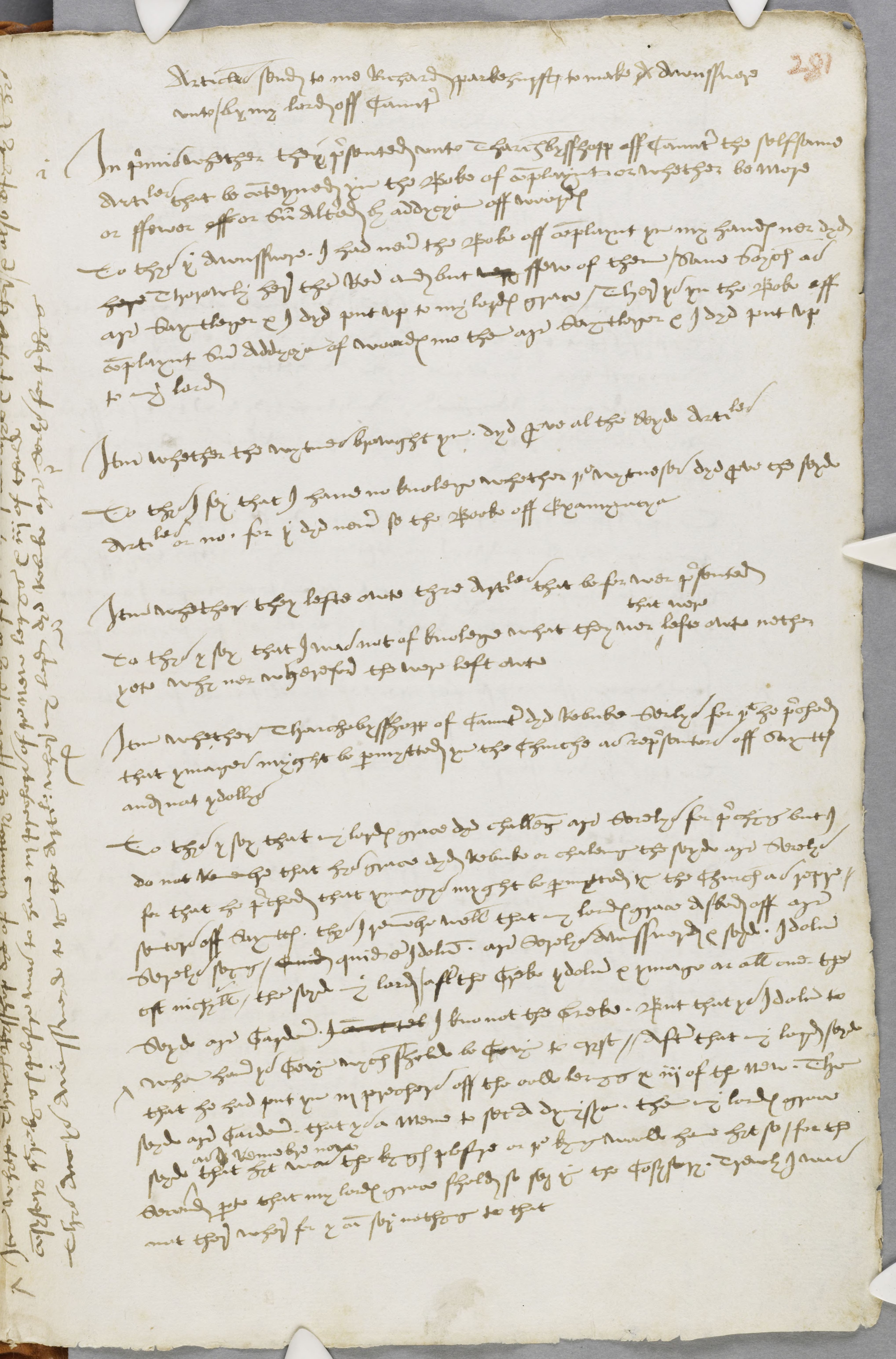 In primis whether they presented unto Tharchbysshopp off Caunterbury the selfsame Articles that be conteyned yn the Boke of complaynt. or whether be more or ffewer off or Sum Altered by addycyon off woordes To thys y Awnsswere. I had never the Boke off complaynt yn my handes nor dyd here Thorowly here them Red and but very ffew of them / same soych as mr sayntleger & I dyd put up to my lordes grace / There ys yn the Boke off complaynt sum Addycyon of woordes mo then mr Sayntleger & I dyd put up to my lord