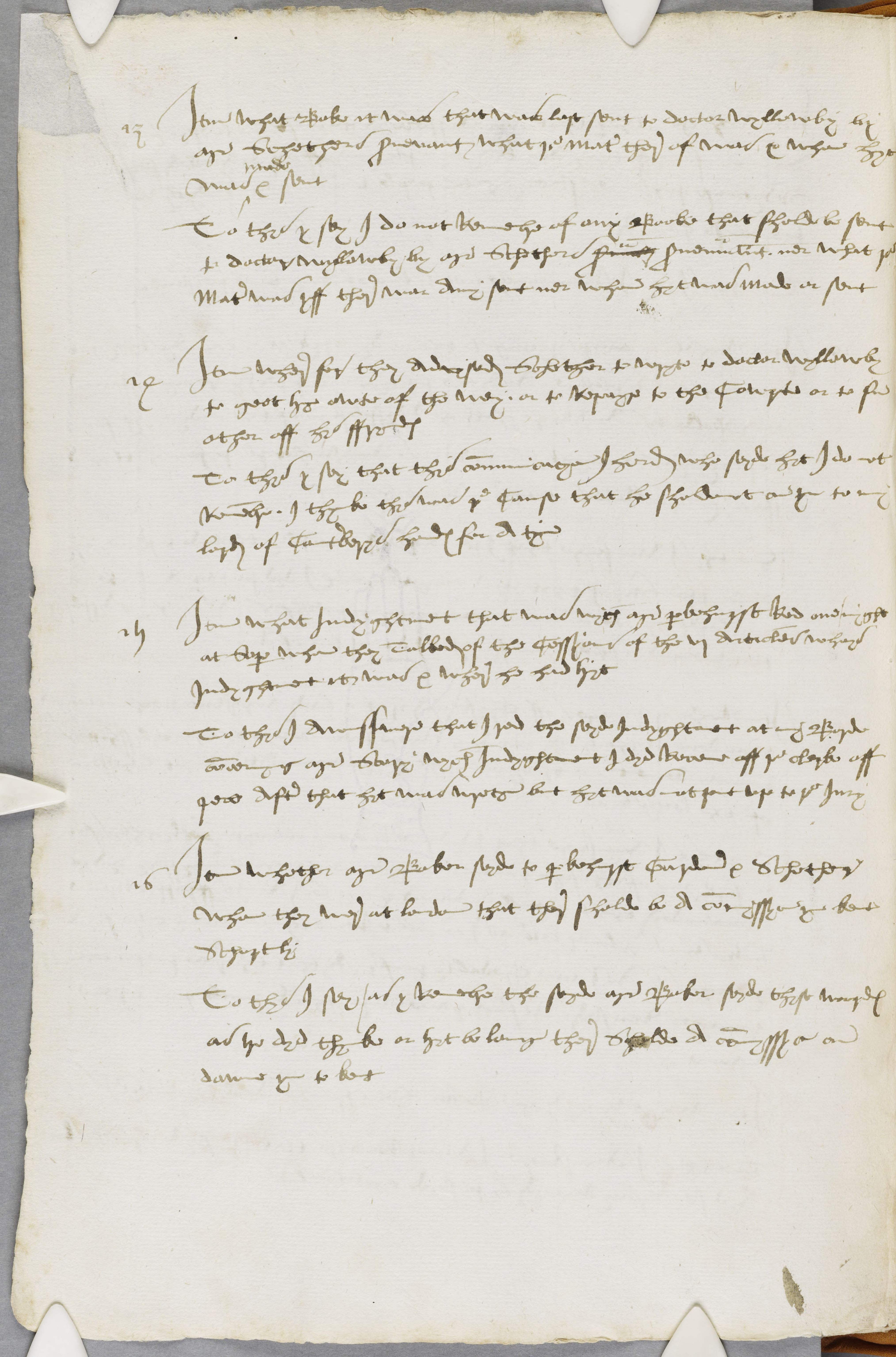 Item what Indyghtment that was wych mr parkhurst Red one/nyght at Seper when they Talked of the Cessyons of the vi Articles whoys Indyghtment it was & where he had hyt To thys I Awnsswere that I red the seyde Indyghtment at my Borde concernyng mr Scory wych Indyghtment I dyd Receve off the clerke off pece After that hyt was wretyn but hyt was not sent upe to the Jury