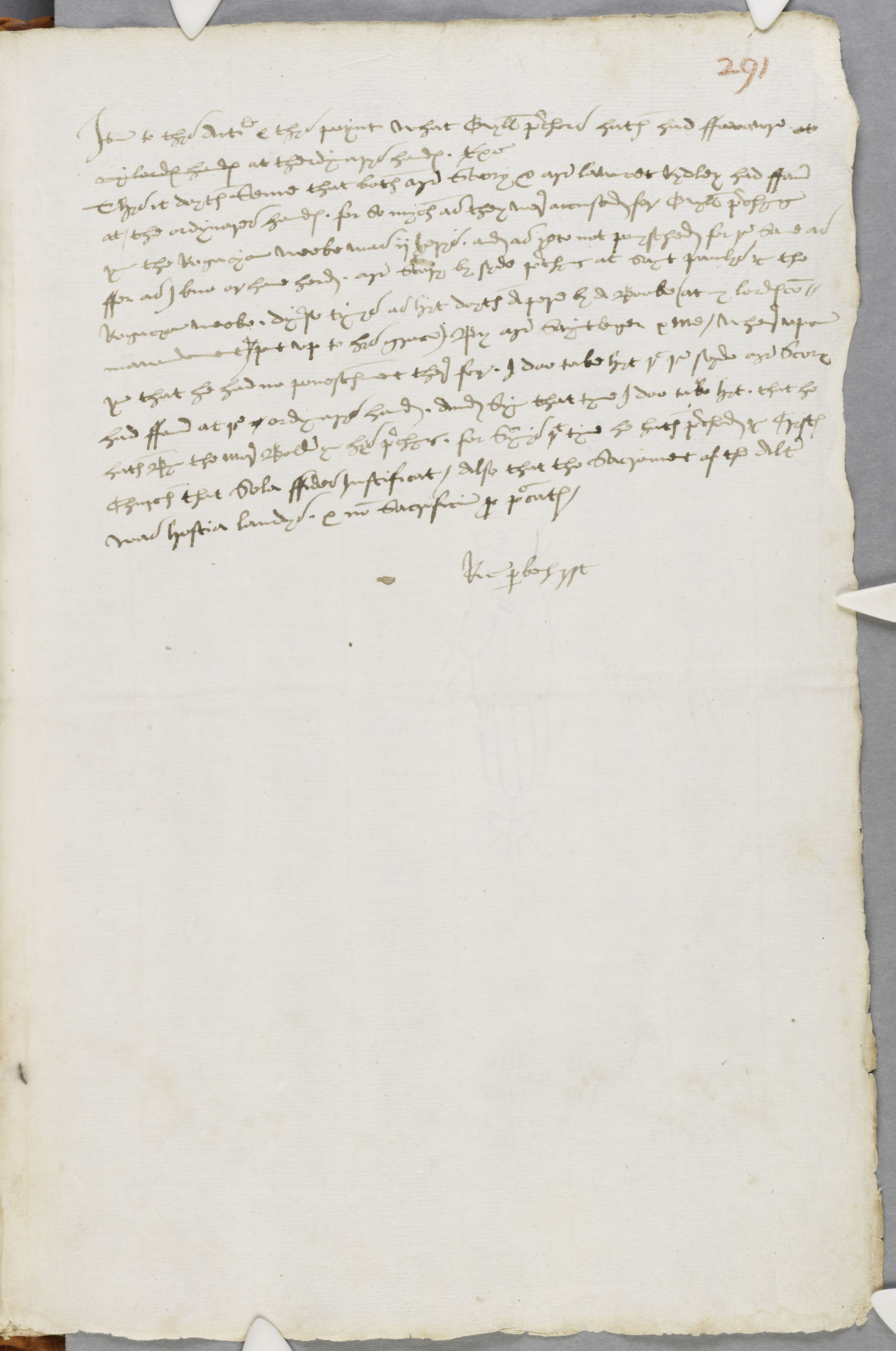 Thys it doyth seme that both mr Scory & mr lawcet Rydley had favour at the ordynareis handes. for so mych as they were acused for Evyll prechyng yn the Rogacyon weeke was ii yeres. and as yete not ponysched for the same as ffer as I kno or have herd. mr scory by syde preched at saynt paulys at the Rogacyon weeke. dyverse tymes as hit doyth Apere by a Booke (at my lordes com mawndement) put up to his grace) By mr Sayntleger & me / where upon yn that he had no puneschment there for. I doo take hyt that the sayde mr Scory had ffevour at the ordynarys hand. And by that tyme I doo take hyt. that he hath byn the more Bold yn his prechis. for syns that tyme he hath preched at Cristes Church that sola ffidei justificat / Also that the sacrement of the Altar was hostia laudys. & non Sacrificium pro pecates