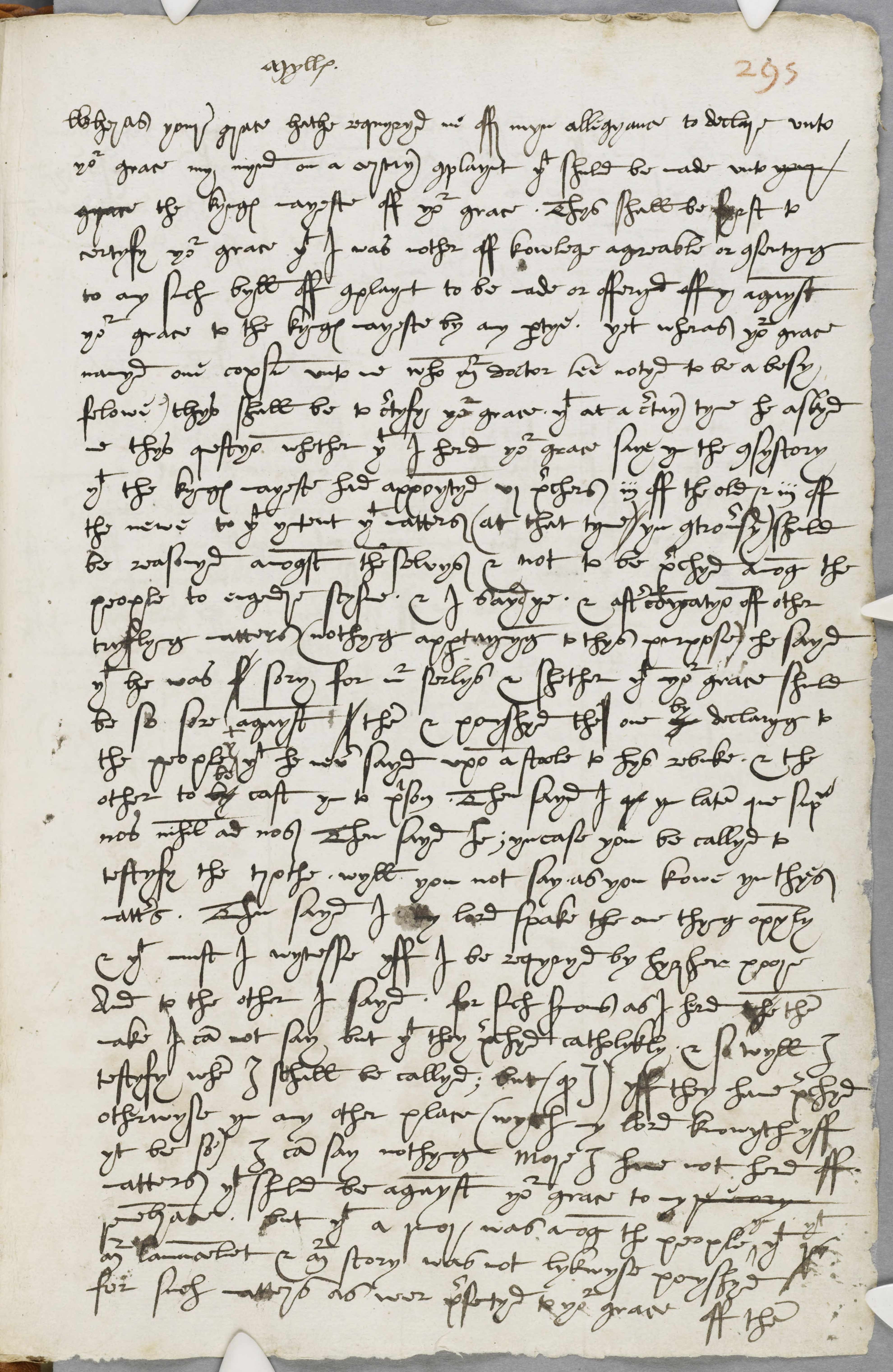 Wheras your grace hathe requyred me off myn allegyance to declare unto your grace my mynd on a certeyn complaynt that shuld be made unto your grace the kynges mayeste off your grace. Thys shall be fyrst to certyfy your grace that I was nother off kowlege agreable or consentyng to any such byll off complaynt to be made or offeryd off y agaynst your grace to the kynges mayeste by any partye. yet wheras your grace namyd one coxsun unto me whom mr doctor lee notyd to be a besy felowe) thys shall be to certyfy your grace that at a certayn tyme he askyd me thys questyon whether that I herd your grace saye yn the consystory that the kynges mayeste had appoyntyd vi prechers iii off the olde & iii of the newe to that yntent that matters (at that tyme) yn controversy) shuld be reasonyd amongst them selvys & not to be prechyd among the people to engendre scysme. & I sayd ye. & after comunycatyon off other tryflyng matters (nothyng appertaynyng to thys purpose) he sayd that he was f sory for mr serlys & Shether that your grace shulde be so sore agaynst s them & ponyshyd them one yn by declaryng to the people that that he never sayd upon a stoole to hys rebuke. & the other to by be cast yn to prison. Then sayd I qu yn laten que supra nos nihil ad nos Then sayd he ; yn case you be callyd to testyfy the trothe. wyll you not say as you knowe yn thyes matters. Then sayd I my lord spake the one thyng opynly & that must I wytnesse yff I be reqyryd by hyghere poore. And to the other I sayd. for such sermons as I herd them them make I can not say but that they prechyd catholykly. & so wyll I testyfy when I schall be callyd ; but (quod I) yff they have prechyd otherwyse yn any other place (wych my lord knowyth yff yt be so) I can say nothyng more I have not here off matters that shuld be agaynst your grace to my rememory remembrance. but that a remor was among the people yn that that re mr launcelet & mr scory was not lykwyse ponyshyd for such matters as wer presentyd to your grace off them