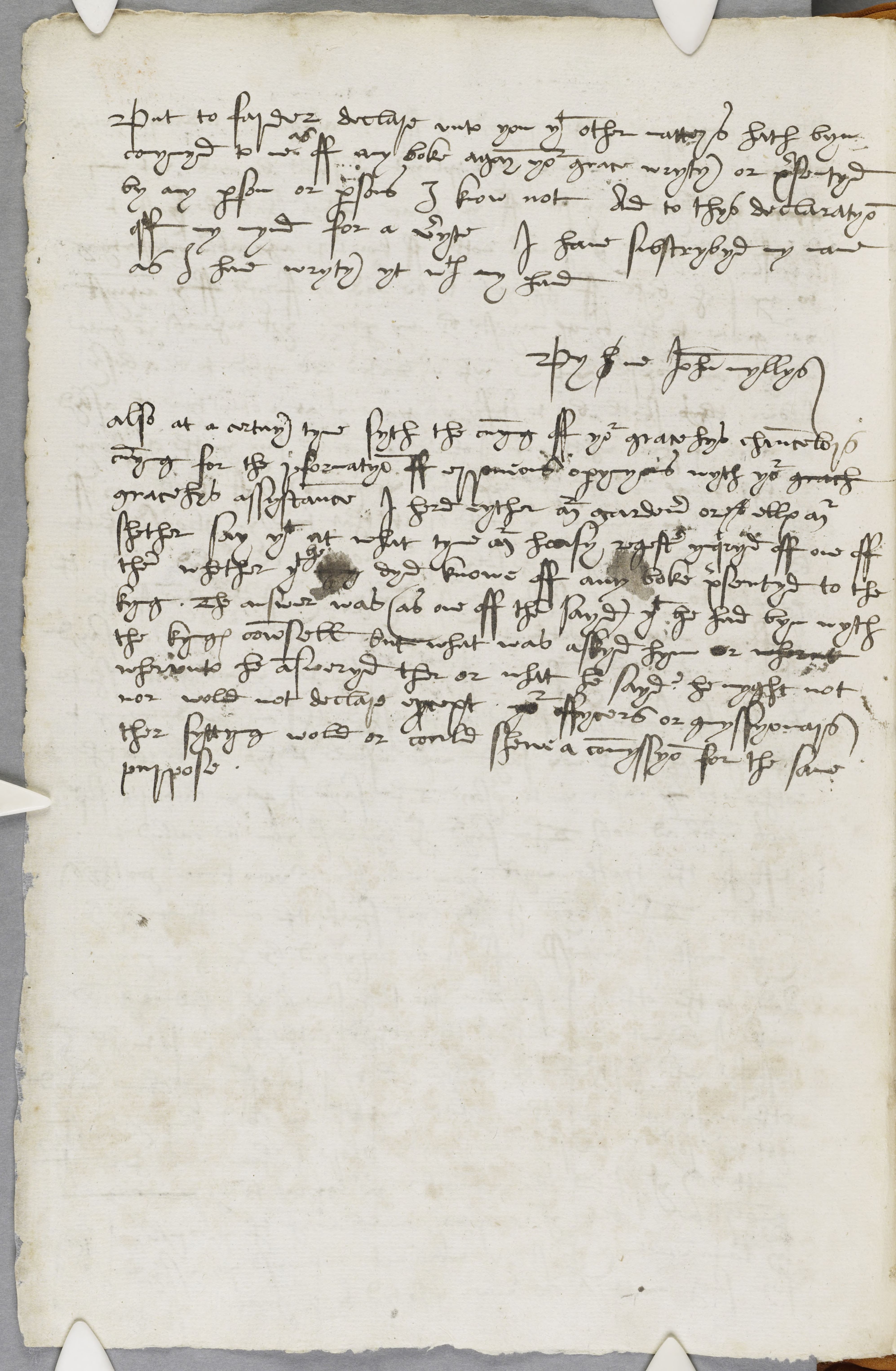 also at a certayn tyme syth the cumyng off your grace hys chauncelors cumyng for the reformatyon off erroneous opynyons wyth your grach gracehys assystaunce I herd eyther mr gardener orel elles mr shether say that at what tyme mr heasy regester ynqiryd off one off them whether that he they dyd knowe off any boke presentyd to the kyng. The answer was (as one off them sayd) that he had byn wyth the kynges cownsell but what was askyd hym or wherut wherunto he answeryd ther or what he sayd ? he myght not nor wold not declare except your offycers or commyssyonars ther syttyng wold or could shewe a commyssyon for the same purpose.