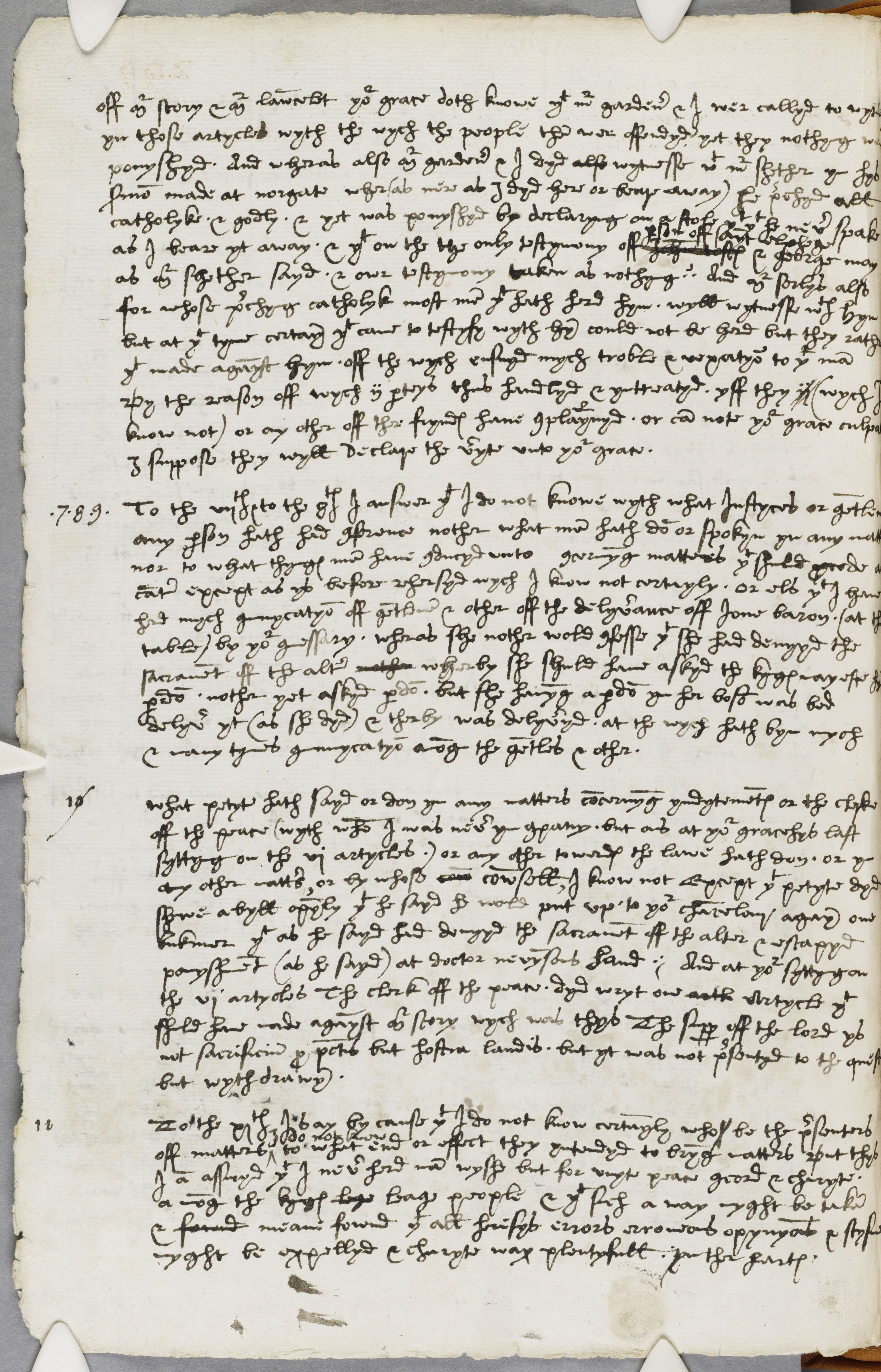 To the vii th & to the 8th I answer that I do not knowe wyth what Justyces or gentlemen any person hath had conference nother what men hath don or spokyn yn any matter nor to what thynges men have conducyd unto concernyng matters that shuld procede at Canterbury except as ys before rehersyd wych I know not certayly. Or els that I have herd mych comunycatyon off gentlemen & other off the delyverance off Jone baron. (at the table) by your commessary. wheras she nother wold confesse that she had denyyd the sacrament off the altar nether wherby she shuld have askyd the kynges mayeste hys pardon. nother yet askyd pardon. but she havyng a pardon yn her bosom was bed delyver yt (as she dyd) & therby was delyveryd. at the wych hath byn mych & many tymes communycatyon among the gentles & other.