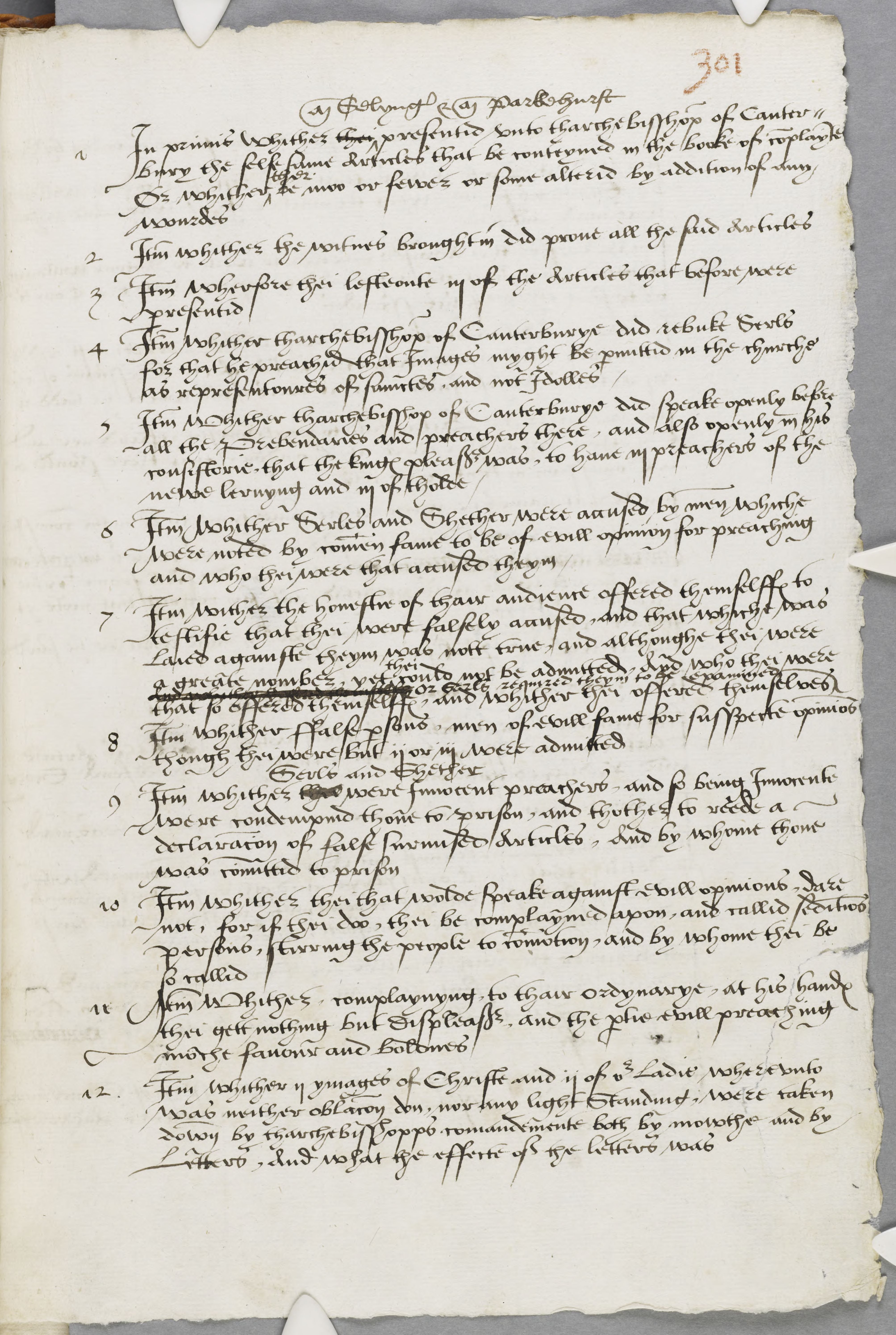 In primis whither thei Mr Selynger & Mr parkehurst presentid unto tharchebisshop of Canter// bury the selfe same Articles that be conteyned in the booke of complaynte Or whither ther be moo or fewer or some alterid by addition of any wourdes
