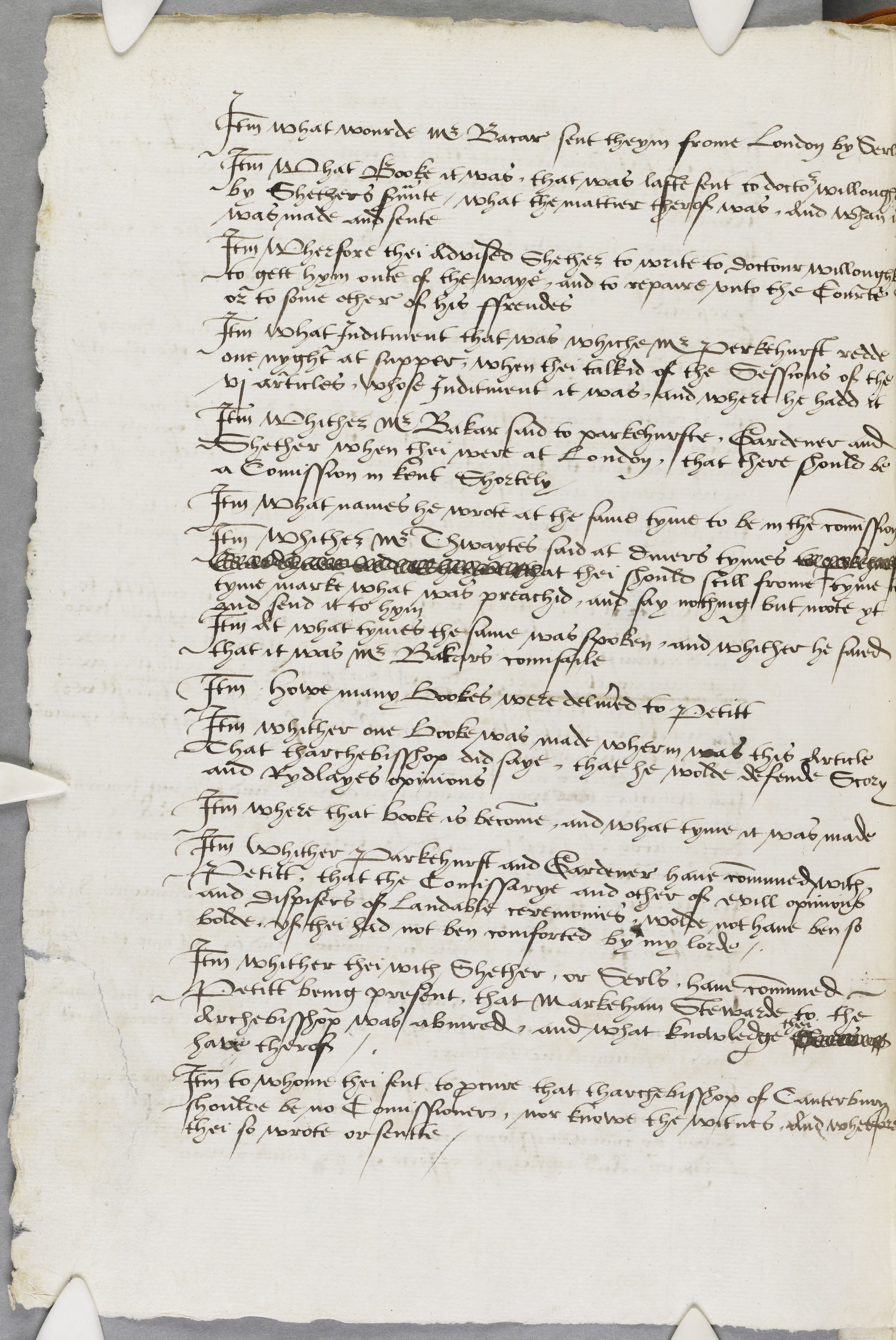 Item what Inditment that was whiche Mr perkehurst reddeone nyght at supper, when thei talkid of the Sessions of the vi articles, whose Inditment it was, and where he hadd it