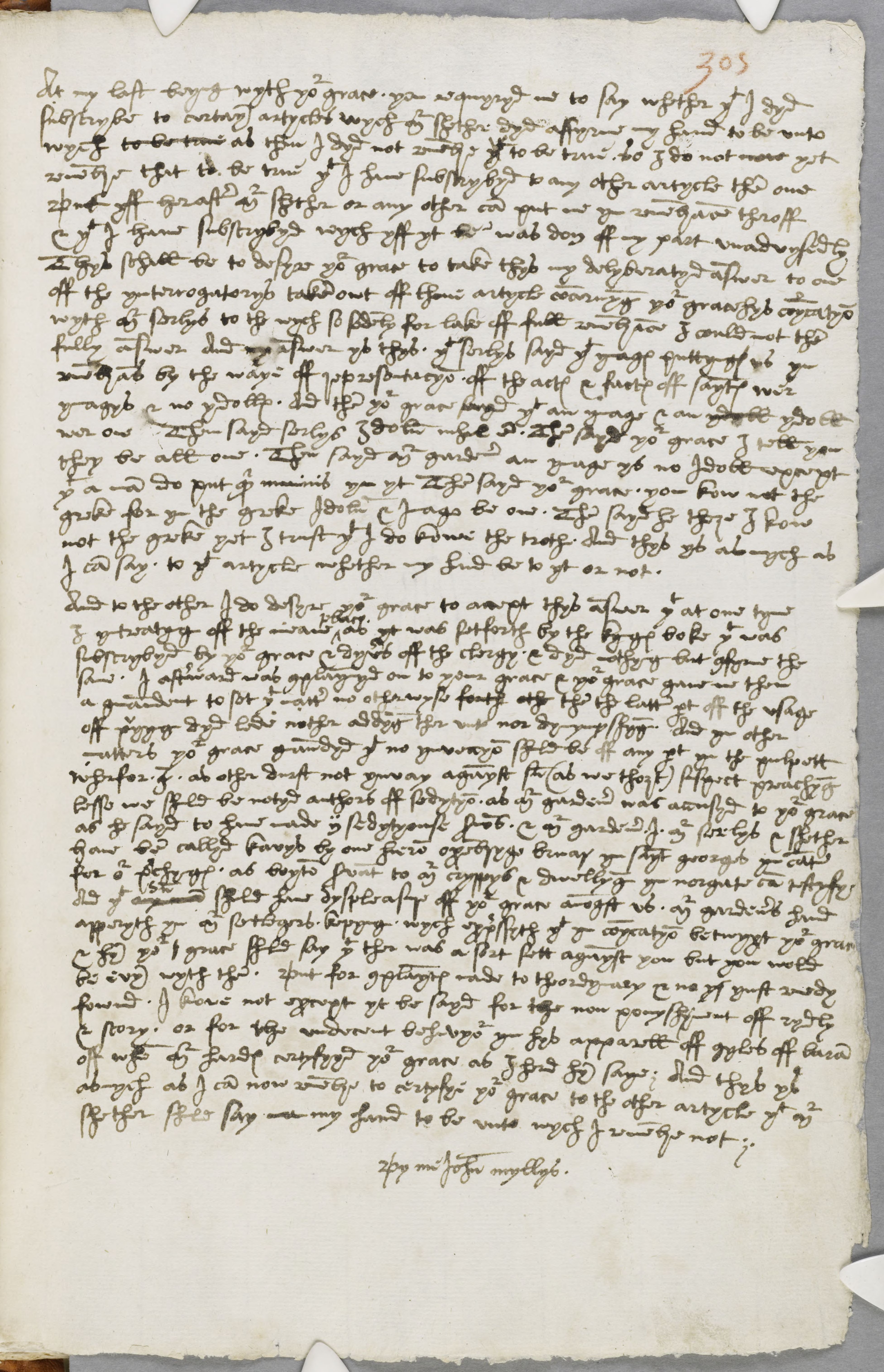 And to the other I do desyre your grace to accept thys answer that at one tyme I yntreatyng off the meane places as yt was setforth by the kynges boke that was subscrybyd by your grace & dyvers off the clergy, & dyd nothyng by confyrme the same. I afterward was complaynyng on to your grace & your grace gave me then a commandement to set that matter no otherwyse forth othe then the latter part off the usage off pryyng dyd lede nother addyng ther unto nor dymynyshyng And yn other matters your grace comaundyd that no ynveacyon shulde be off any part yn the pulpett wherfor I as other durst not ynvay agaynst sum (as we thogt) suspect preachyng lesse we shuld be notyd authors off sedytyon as mr gardener was accusyd to your grace as he sayd to have made ii sedytyouse sermons, & mr gardener I mr serlys & shether have ben callyd kavys by one hierom oxenbryge bruar yn saynt georges yn canterbury for our prechynges. as boyton servant to mr cryppys & dwellyng yn norgate can testyfy And that any man sum shuld have dyspleasure off your grace amongst us. mr gardeners hand apperyth yn mr sentlegers kepyng wych expressyth that yn comunycatyon betwyxt your grace & hym your grace shuld say that ther was a sort sett agaynst you but you wold be evyn wyth them. But for complayntes made to theordynary & no ys yust redy fownd. I kowe not except yt be sayd for the non ponyshyment off rydly & scory. or for the undecent behavyor yn hys apparell off gyles off baram off whom mr hardes certyfyyd your grace as I herd hym saye ; And thys ys asmych as I can now remembre to certyfye your grace to the other artycle that mr shether shulde say me my hand to be unto wych I remembre not ;