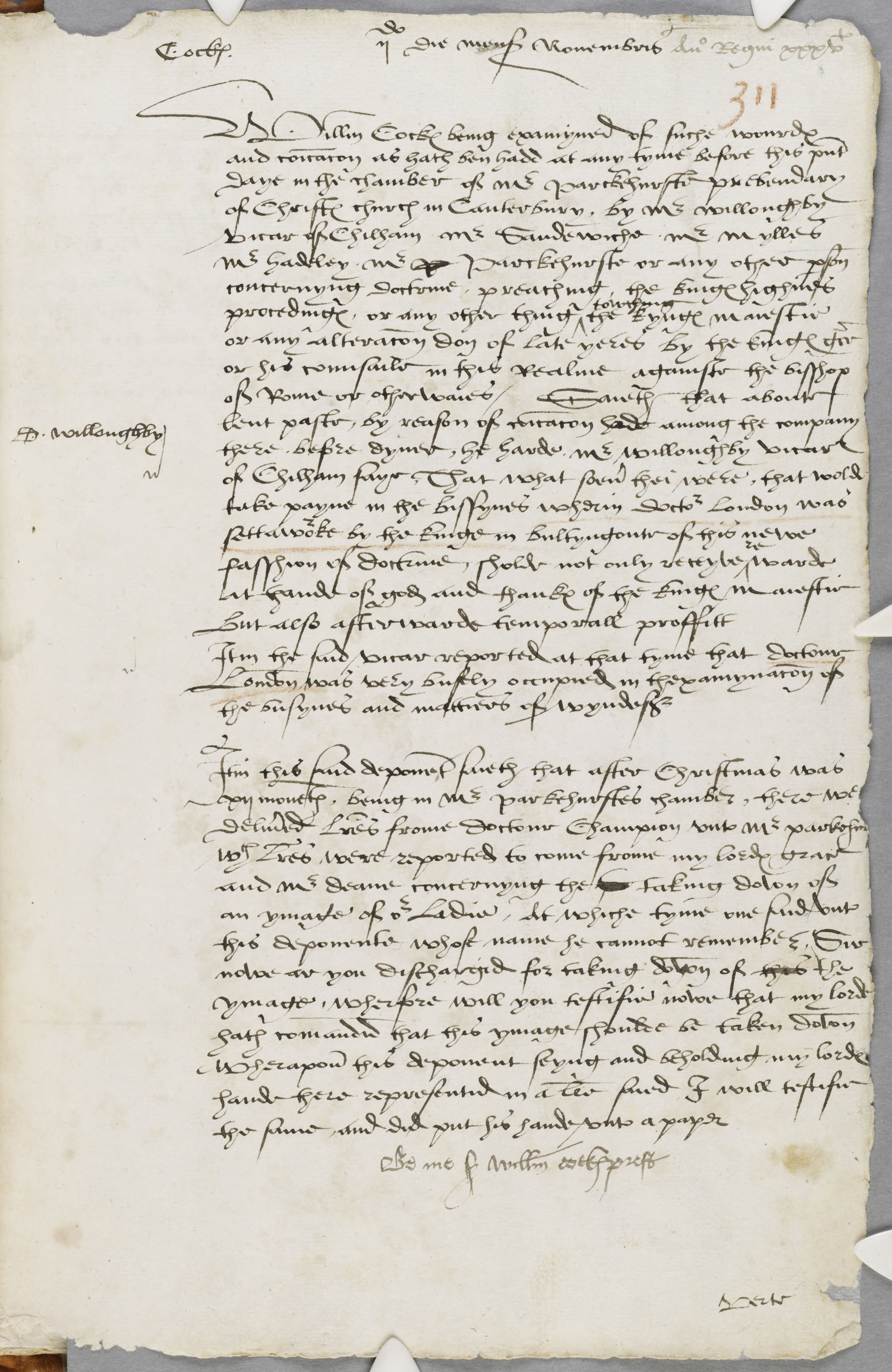 William Cockes being examyned of such wourdes and communicacion as hath ben hadd at any tyme before this present daye in the chamber of Mr parckhuste prebendary of Christes church in Canterbury, by Mr Willoughby vicar of Chilham mr Sandewiche Mr Mylles Mr hadeley Mr parkehurste or any other person concernyng doctrine, preaching, the kinges highnes procedinges, or any other thing towching kynges maiestie or any alteracion don of late yeres by the kinges grace or his counsaile in this Realme againste the bisshop of Rome or otherwaies / Saieth that about lent paste, by reason of communicacion had among the company