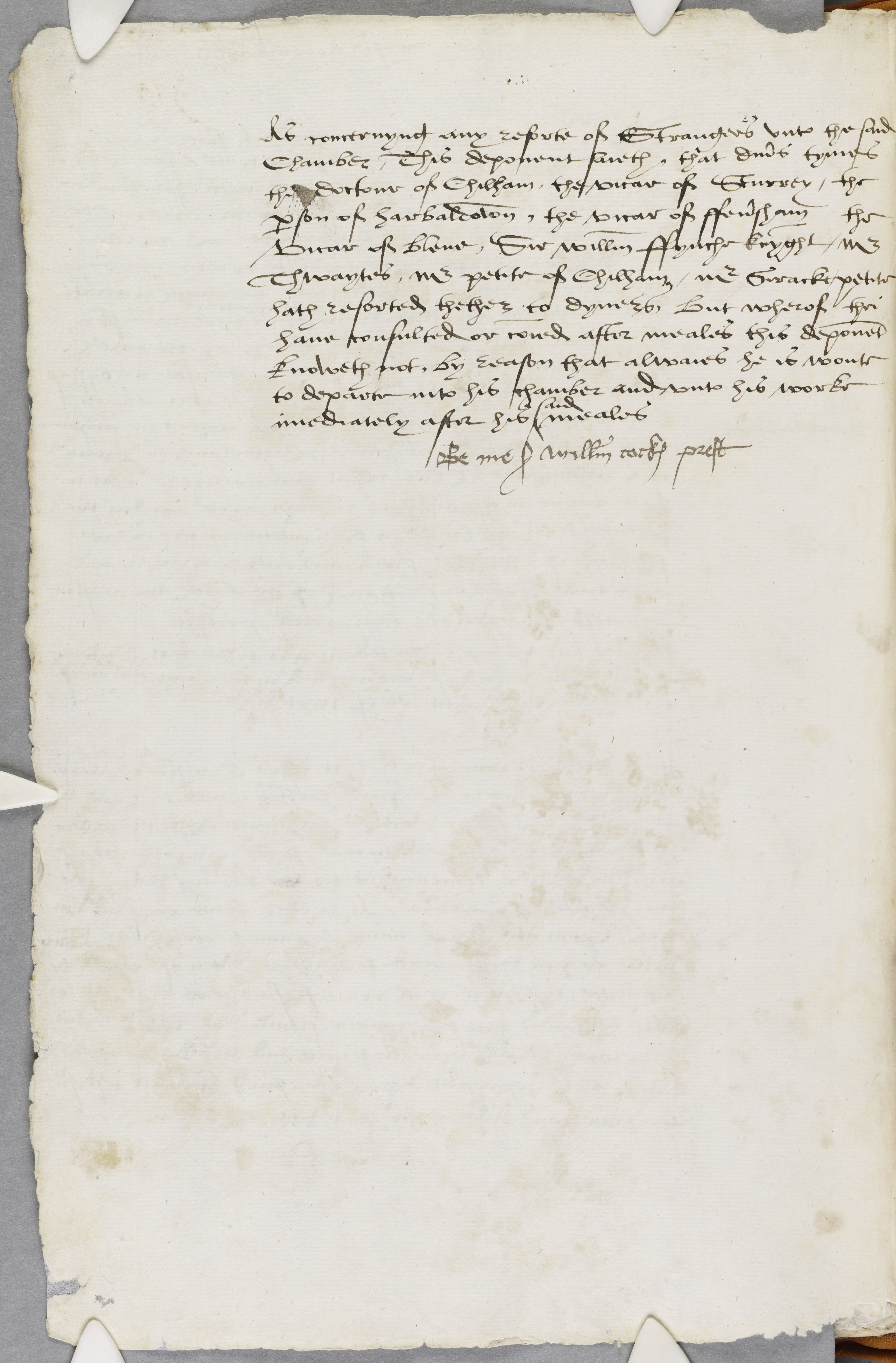 As concernyng any resorte of Strangers unto the said Chamber / This deponent saieth that divers tymes the doctour of Chilham, the vicar of Sturrey / the parson of harbaldown, the vicar of ffeversham the vicar of blene, Sir William ffynche knyght / mr Thwaytes, Mr petite of Chilham / mr Siracke petite hath resorted thether to dyvers, but wherof thei have consulted or comuned aftir meales this deponent knoweth not, by reason that alwaies he is wonte to departe into his chamber and unto his worke imediately after his said meales.