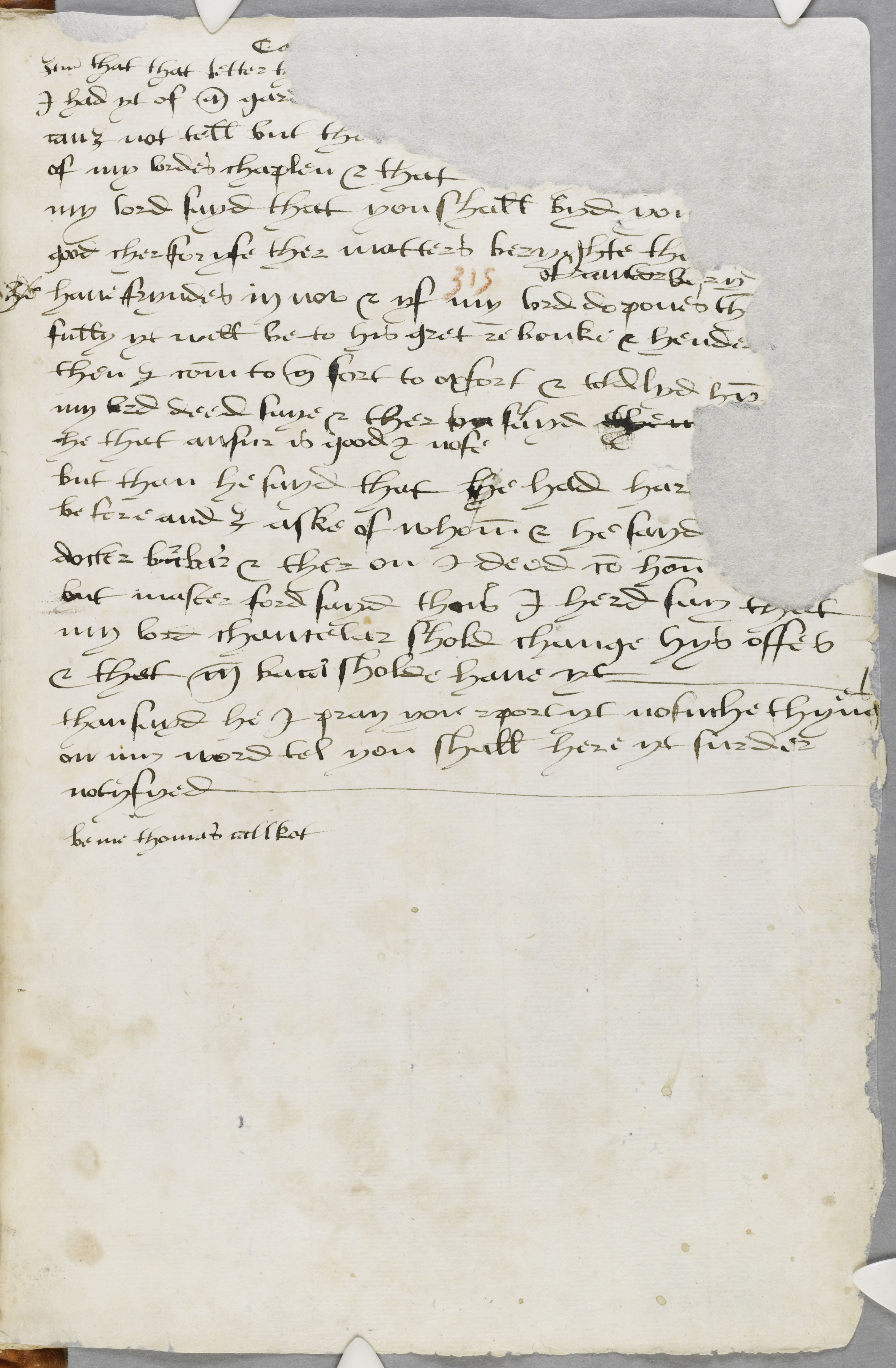 Item that that letter th I had yt of mr gardener can I not tell but th of my lordes chaplen & that my lord sayd that you shall byd you good cher for yfe ther matters beryghte th have fryndes in nov & yf my lord do ponesth fully yt will be to his gret rebouke & henderance then I comm to mr Fort to oxfort & toldlyd hym mylord deed saye & ther sayd the he that ansur is good I nofe but than he sayd that he had hard be fore and I aske of whom & he sayd docter barbar & ther on I deed com hon but master ford sayd thus I herd say that my lord chancelar shold change hys offes & that mr bacer sholde have yt than sayd he I pray you reportyt nosuche thynges on my word tel you shall here yt furder notyfyed.