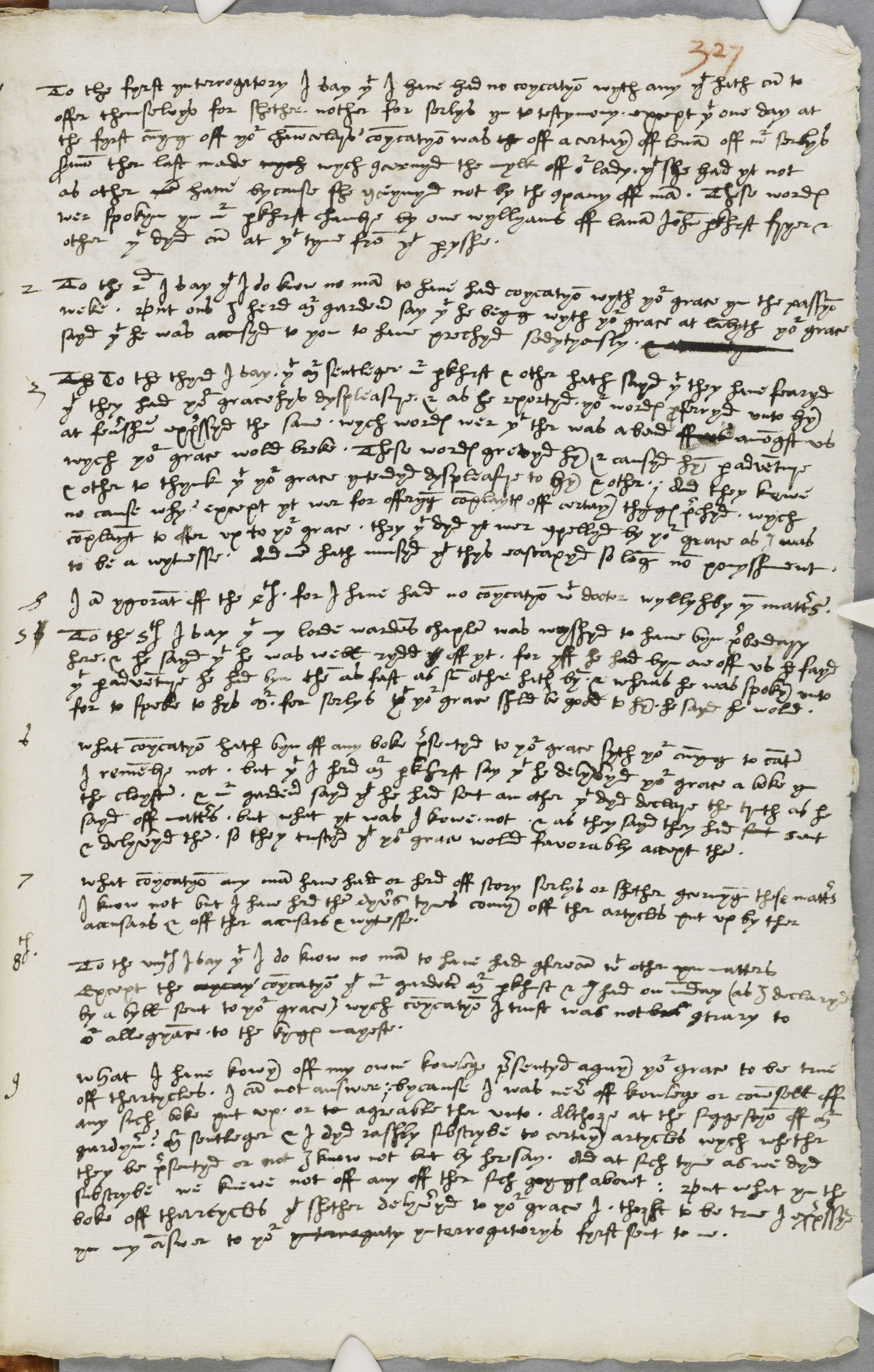 To the fyrst ynterrogatory I say that I have had no comunycatyon wyth any that hath cum to offer themselvys for shether nother for serlys yn to testymony except that one day at the fyrst cumyng off your chauncelars comunycatyon was the off a certayn off lenam off mr serlys sermon ther last made wych wych concernyd the mylk off our lady. that she had yt not as other men have bycause she conceyvyd not by the company off man. Those wordes wer spokyn yn mr parkhurst chambre by one wyllyams off lanam John parkhurst fryer & other that dyd cum at that tyme from that paryshe.