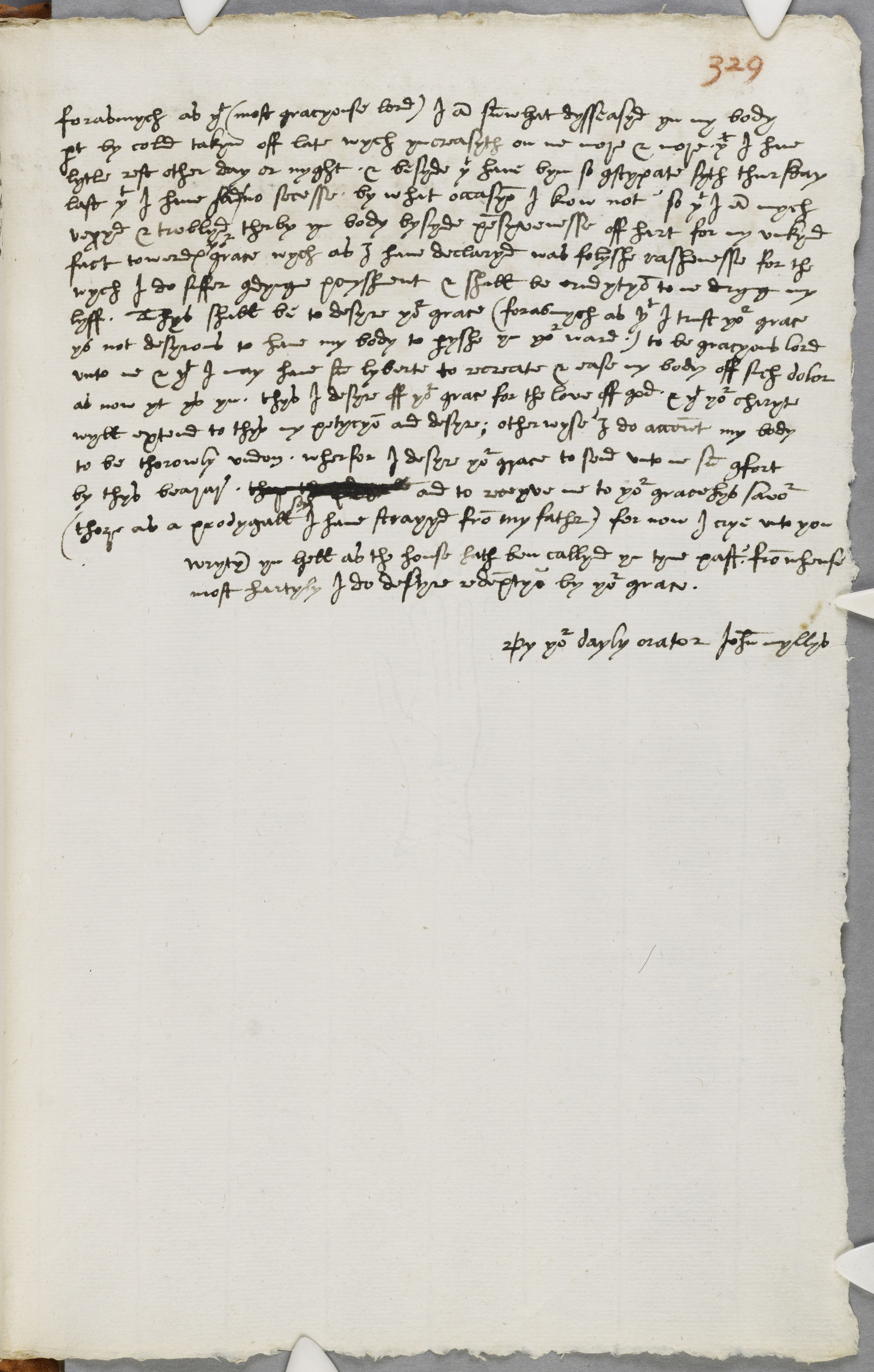 forasmych as that (most gracyouse lord) I am sumwhat dysseasyd yn my body part by cold takyn off late wych yncreasyth on me more & more that I have lytle rest other day or nyght & besyde that have byn so constypate syth thursday last that I have had/no sucesse by what occasyon I know not so that I am mych vexyd & troblyd therby yn body bysyde xesyvenesse off hart for my vekyd fact towardes yourgrace wych as I have declaryd was folyshe rashenesse for the wych I do suffer condyng ponyshment & shall be erudytyon to me duryng my lyff. Thys shall be to desyre your grace (forasmych as that I trust your grace ys not desyrous to have my body to peryshe yn your ward) to be gracyous lord unto me & that I may have sum lyberte to recreate & ease my body off such dolor as now yt ys yn. Thys I desyre off your grace for the love off god & that your chiryte wyll extend to thys my petycyon and desyre ; otherwyse I do account my body to be thorowly undon. wherfor I desyre your grace to send unto me sum confort by thys bearar. they and to receyve me to your grace hys favor (thoge as a prodygall son I have strayyd from my father) for now I crye unto you wrytyn yn hell as the house hath ben callyd yn tyme past from whense most hartyly I do desyre redemptyon by your grace.