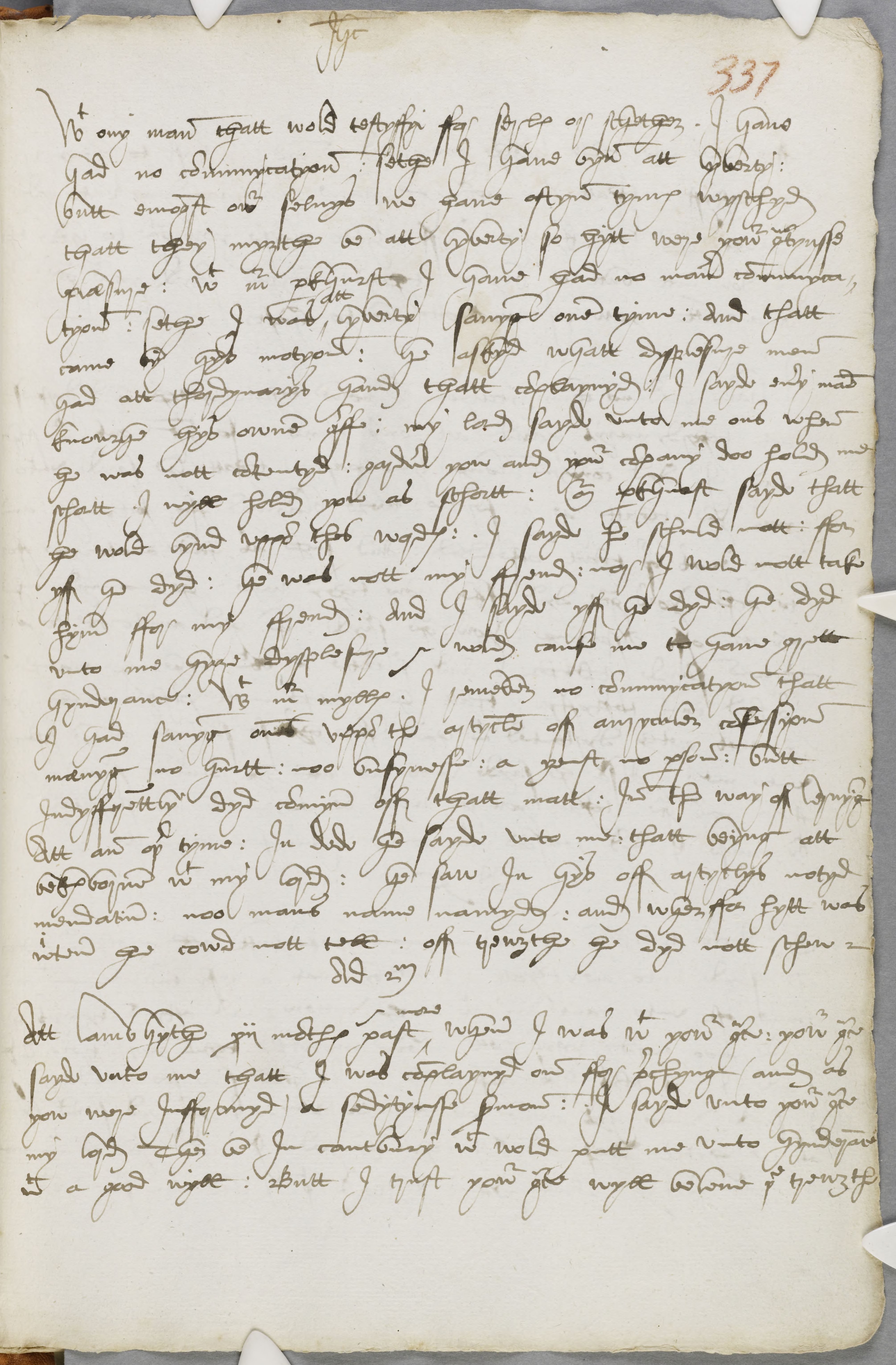With any man thatt wold testyffyi ffor serles or schether. I have had no communycatyon : sethe I have byn att lyberty : butt emongst owr selvys we have oftyn tymes wyschyd thatt they mygthe be att lyberty so hytt were yowr gracyusse plaesure : with mr parkhurst I have had no maner communyca tyon : sethe I was att lyberty savyng one tyme : And thatt came by hys motyon : he askyd whatt dysplesure men had att thordynarys hand thatt complaynyd : I sayde every man knowghe hys owne greffe : my lord sayd unto me ons when he was nott contentyd : gardiner yow and yowr company doo hold me shortt I wyll hold you as schortt : Mr parkhurst sayde thatt he wold bynd uppon thes wordes : I sayde he schulde nott : ffor yff he dyd : he was nott my ffrend : nor I wold nott take hym ffor my ffrend : And I sayde yff he dyd : he dyd unto me hyge dysplesure & wold cause me to have grett hynderance : with mr mylles. I remember no communycatyon thatt I had savyng ons uppon the artycle off aurycyler confessyon maenyng no hurtt : noo busynesse : a yenst no person : butt Indyfferenttly dyd commyn off that matter : In the way off lernyng Att an other tyme : In dede he sayde unto me thatt beyng att bekesborne with my lord: he saw In hys off artyclys notyd mendacium : noo mans name namyd : and wherffor hytt was writen he cowd nott tell : ff treugthe he dyd nott schew.