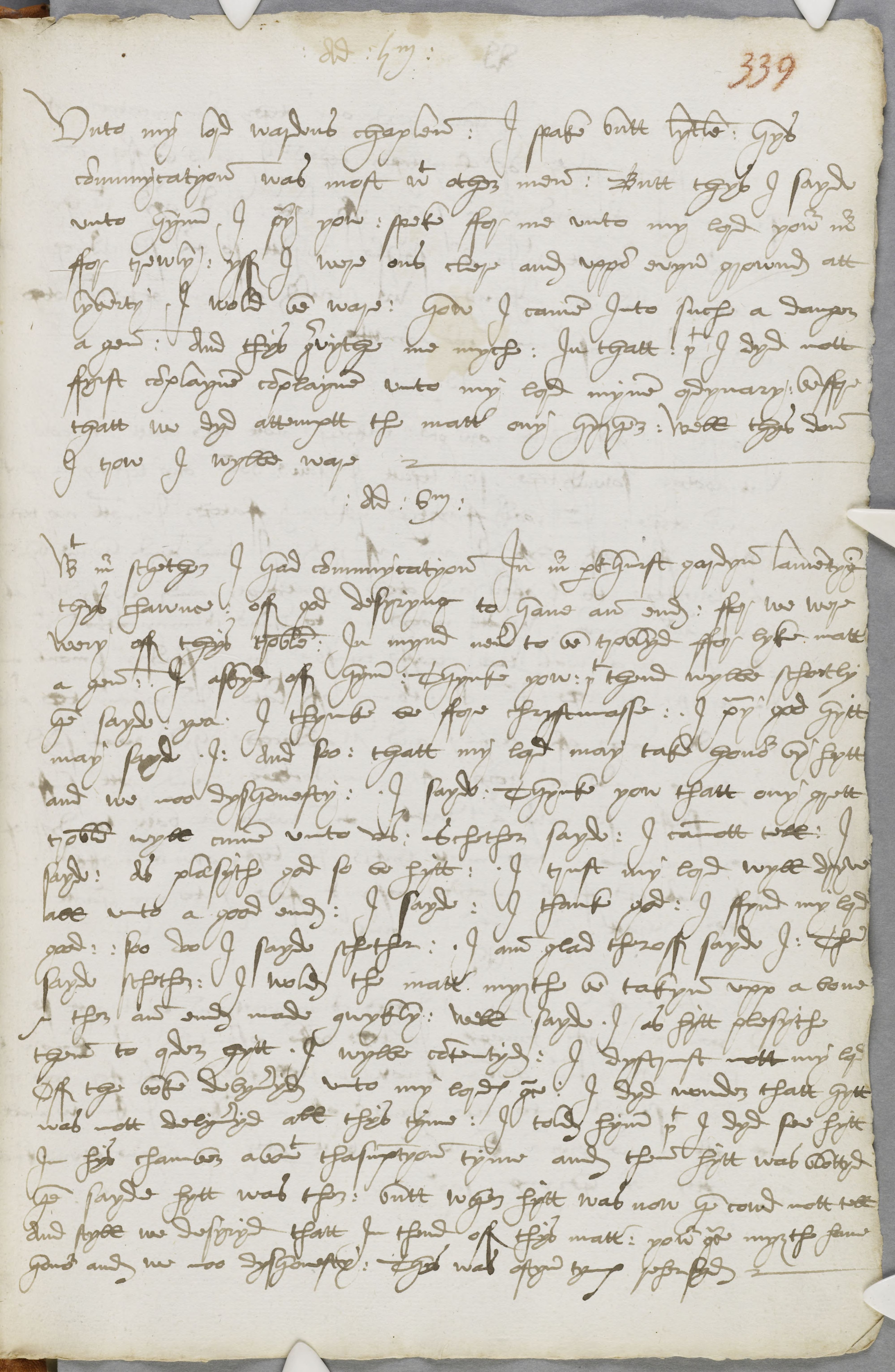 With mr schether I had communycatyon In mr parkhurst gardyn lamentyng thys chawnce : off god desyryng to have an end : ffor we were wery off thys troble : In mynd never to be troblyd ffor lyke matter a gen : I askyd off hym : Thynke yow : that thend wylbe schortly he sayde : yea I thynke be ffore chrystmasse : I pray god hytt may sayd I : And soo : that my lord may take honor by hytt and we noo dyshonesty : I sayde Thynke yow that any grett troble wyll cumme unto us : Shether sayde : I cannot tell : I sayde : As plaesyth god so be hytt : I trust my lord wyll dryve all unto a good end ; I sayde : I thank god : I ffynd my lord good : soo doo I sayde schether : I am glad theroff sayde I : Then sayde schether : I wold the matter myghte be takyn upp a bove & ther an end made qwykly : well sayde I / as hytt plesythe them to order hytt. I wylbe contentyd : I dystrust nott my lord Off the boke delyveryd unto my lordes grace : I dyd wonder thatt hytt was nott delyveryd all thys tyme : I told hym that I dyd see hytt In hys chamber abowt thasumptyon tyme and then hytt was blottyd he sayde hytt was ther : butt wher hytt was now he cowd nott tell And styll we desyryd thatt In thend off thys matter : yowr grace myghte have honor and we noo dyshonesty : Thys was oftyn tymes rehersyd.