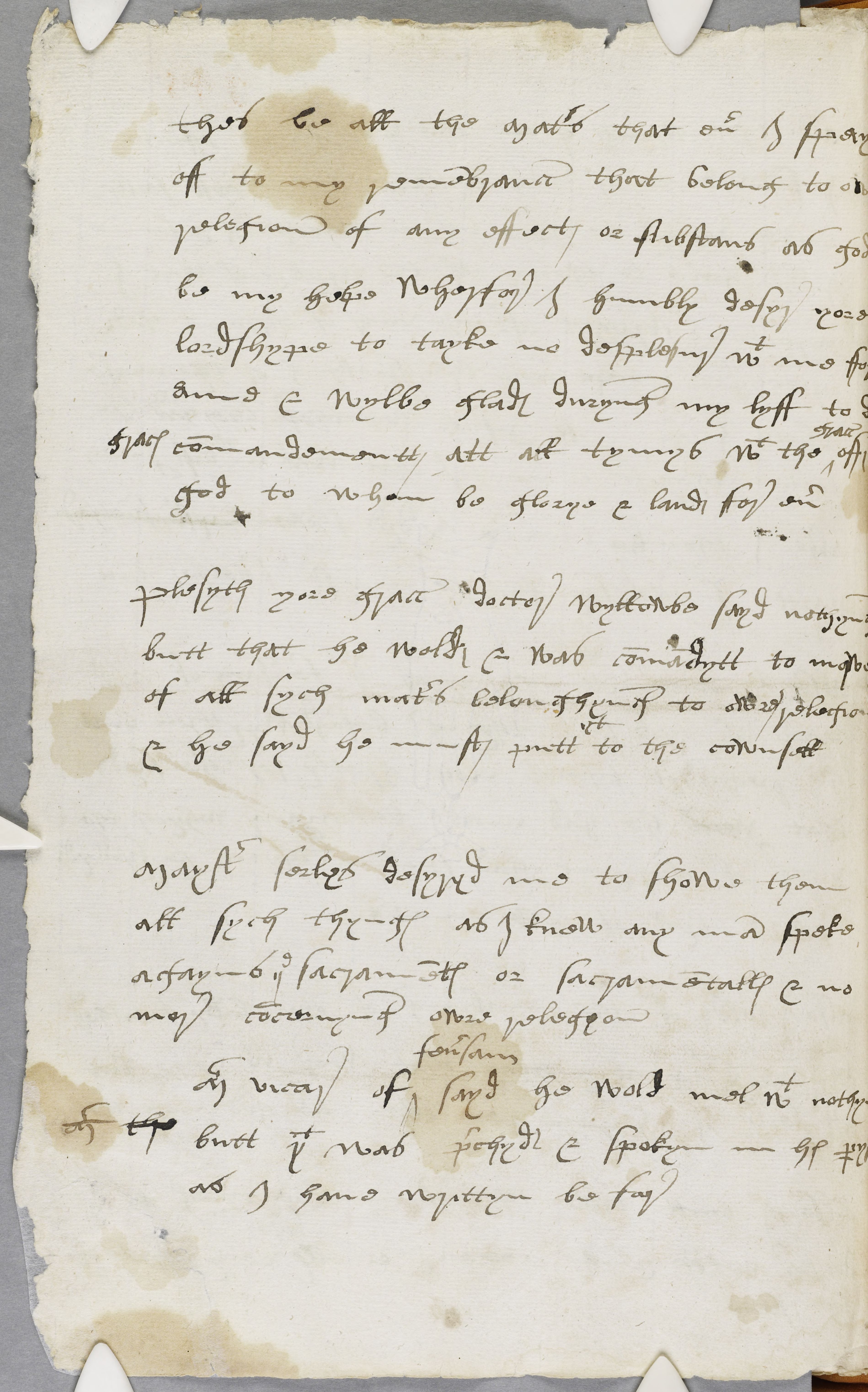 Thes be all the matters that ever I spayk off to my remembrance that belong to owr relegion of any effectes or sbstans as god be my helpe Wherfor I humbly desyr yore lordshype to tayke no despplesure with me for ame and wylbe glad duryng my lyff to doo graces commandementtes att all tymys with the grace off god to whom be glorye and laud for ever.
