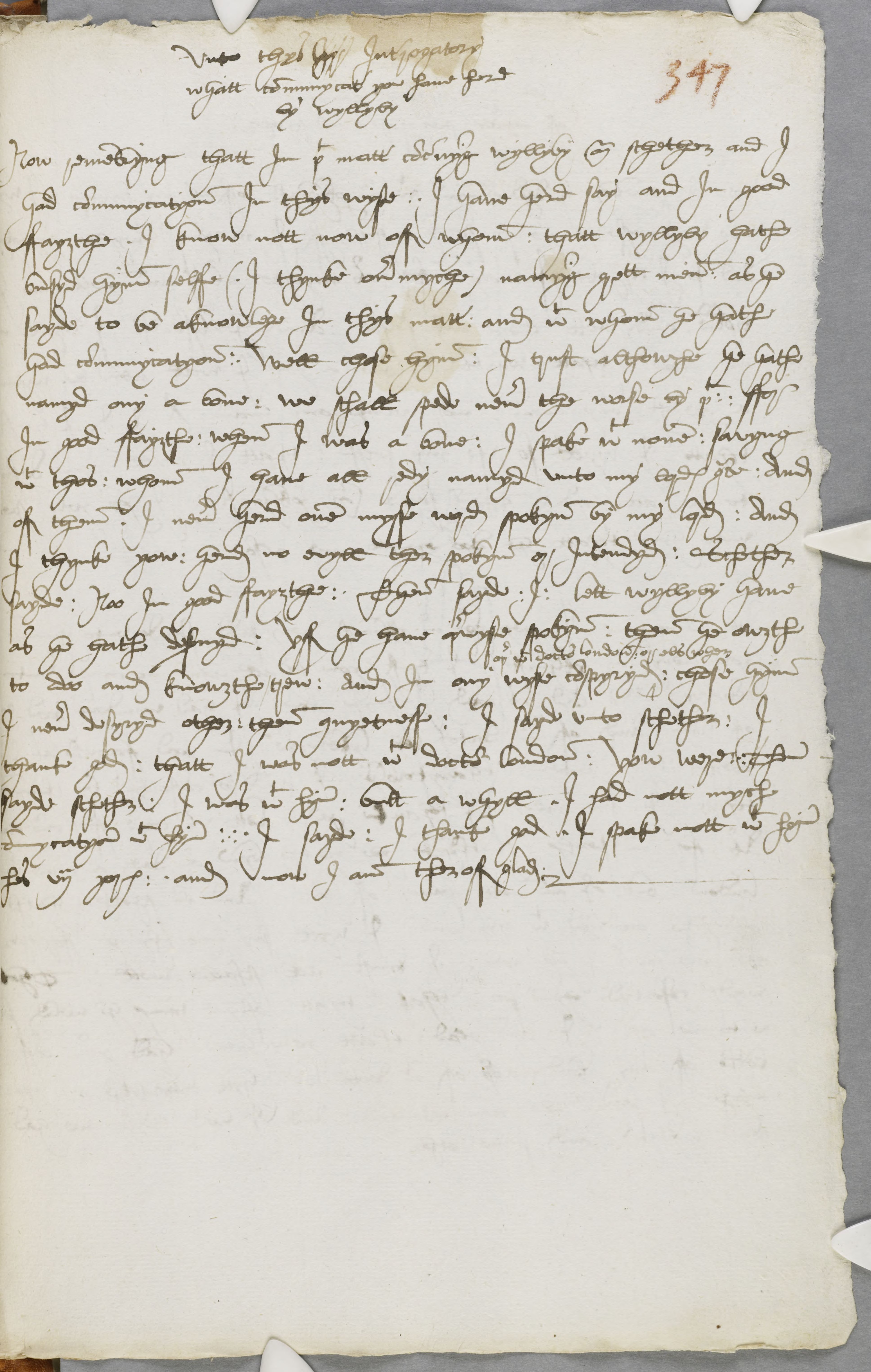 Now rememberyng thatt in that matter concernyng wyllyby mr schether and I had communycatyon In thys wyse : I have herd say and In good faygthe I know nott now off whom : thatt wyllyby hathe busyd hym selfe (I thynke overmyche) namyng grett men : as he sayde to be aknowlege In thys matter : and with whom he hathe had communycatyon : well chose hym : I trust althowghe he hathe namyd any a bove : we schall spede never the worse by that : ffor In good ffaygthe : when I was a bove : I spake with none : savyng with thos : whom I have all redy namyd unto my lordes grace : And off them I never herd one mysse word spokyn by my lord : And I thynke yow : herd no evyll ther spokyn or Intendyd : Schether sayde : Noo In good faygthe : Then sayde : I : lett wyllyby have as he hathe deservyd : Yff he have otherwyse spokyn : then he owght to doo and knougthe trew : And In any wyse conspyred: other with doctor london or els when : chose hym I never desyryd other : then quyetness : I sayd unto schether : I thank god : thatt I was nott with doctor london : yow were : Then sayde schether : I was with hym : butt a whyll. I had nott mych communycatyon with hym : I sayde : I thank god I spake nott with hym thes vii yeres and now I am theroff glad.