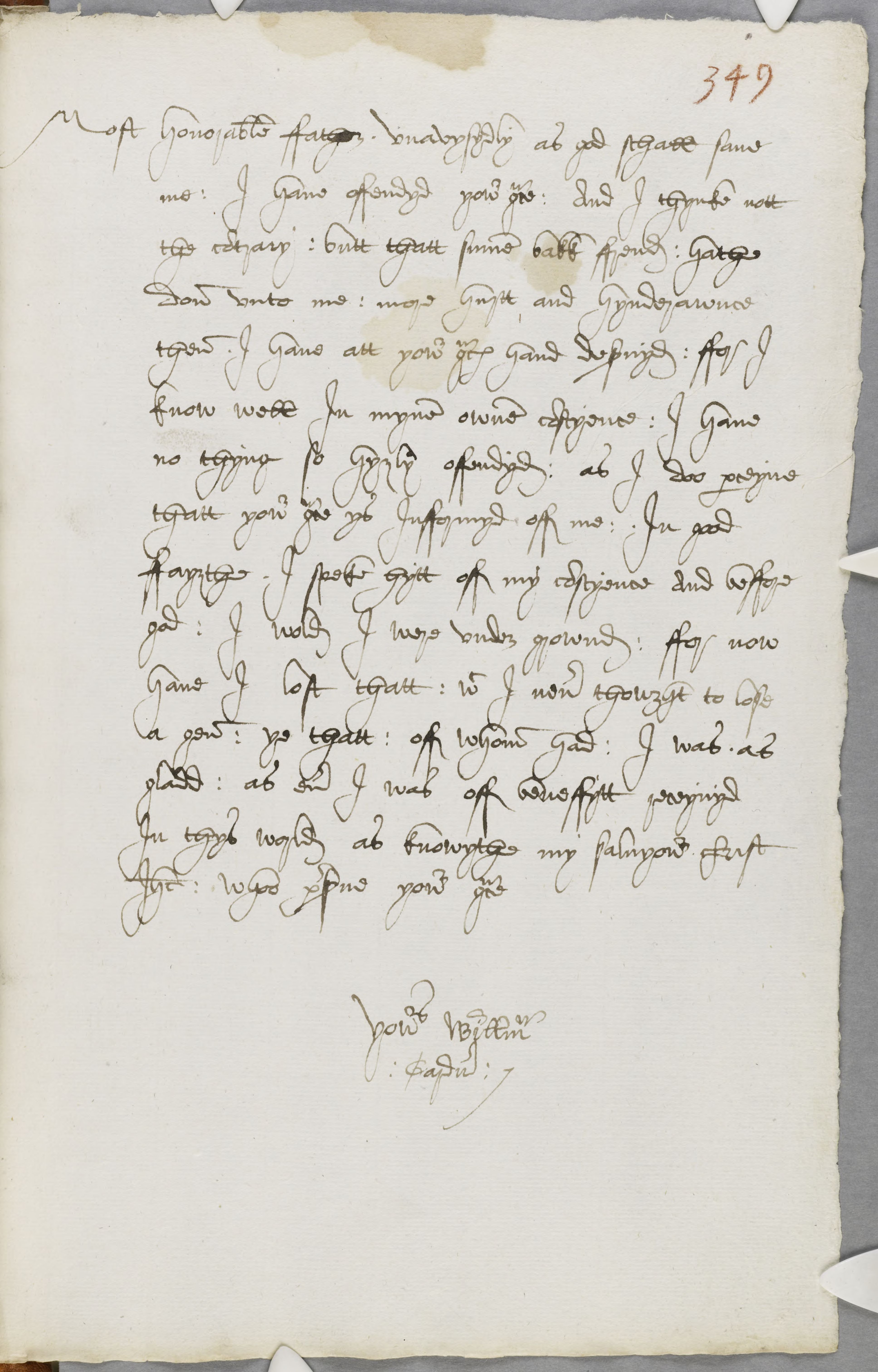 Most honorable ffather unavysydly as god shall save me : I have offendyd yowr grace ; And I thynke nott the contrary : butt thatt summe bakk ffrend : hath don unto me : more hurt and hynderawnce then I have att yowr graces hand deservyd : ffor I know well In myne owne conscyence : I have no thyng so hygly offendyd : as I doo perceyve thatt yowr grace ys Infformyd off me : In good ffaygthe I speke hytt off my conscyence And beffore god : I wold I were under grownd : ffor now have I lost thatt : which I never thought to lose a gen : ye thatt : off whom had : I was as gladd : as ever I was off beneffytt receyvyd In thys world as knowythe my salvyour christ Jhesus : who preserve your grace