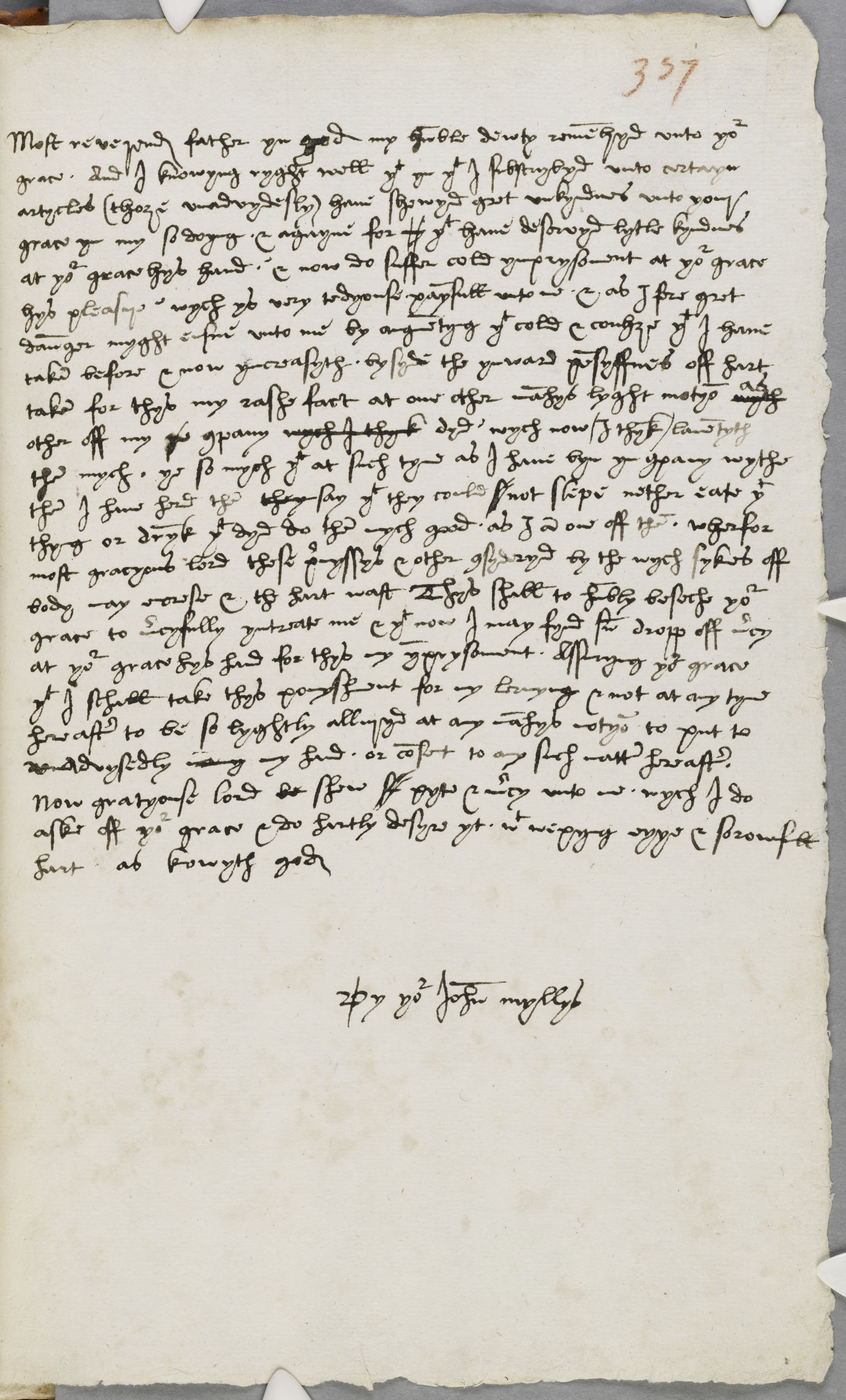 Most reverend father yn god my humble dewty remembryd unto your grace. And I knowyng ryght well that yn that I subscrybyd unto certayn artycles (thoze unadvydesly) have showyd gret unkyndnes unto your grace yn my so doyng & agayne for that have deservyd lytle kyndnes at your grace hys hand: & now do suffer cold ymprysonent at your grace hys pleasyre wych ys very tedyouse paynfull unto me & as I fere gret daunger myght ensue unto me by augmentyng that cold and couhge that I have taken before & now yncreasyth. bysyde the ynward pensyffnes off hart taken for thys my rashe fact at our other manhys lyght motyon as wyth other off my company which I thynk dyd wych now (I thynk) lamentyth them mych. ye so mych that at such tyme as I have byn yn company wythe them I have herd them they say that they could not slepe nether eate that thyng or drynk that dyd do them mych good. as I am one of them. wherfor most gracyous lord these premysses and other consyderyd by the wych syknes off body may encrese & the hart wast Thys shall to humbly beseche your grace to mercyfully yntreate me & that now I may fynd sum dropp off mercy at your grace hys hand for thys my ymprysoment. Assuryng your grace that I shall take thys ponyshment for my lernyng & not at any tyme hereafter to be so lyghtly alluryd at any manhys motyon to put to unadvysedly my hand or consent to any such matter herafter. Now gratyouse lord shew pyte & mercy unto me. wych I do aske off your grace & do hirtly desyre yt. with wepyng eyye & sorowfull hart as knowyth god.